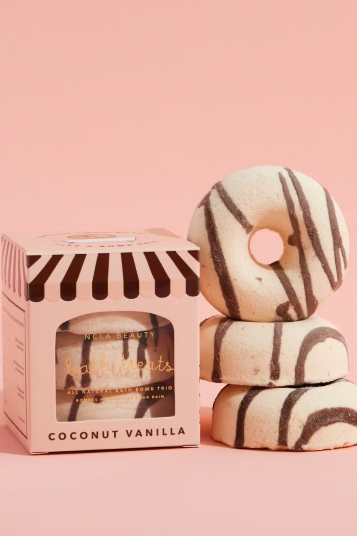 Each set comes with 3 donut shaped bath treats made with nourishing, skin-soothing, and hydrating ingredients like epsom salt, kaolin clay, and shea butter. It's also infused with an essential oil blend to bring an aromatherapeutic experience to your bath time.