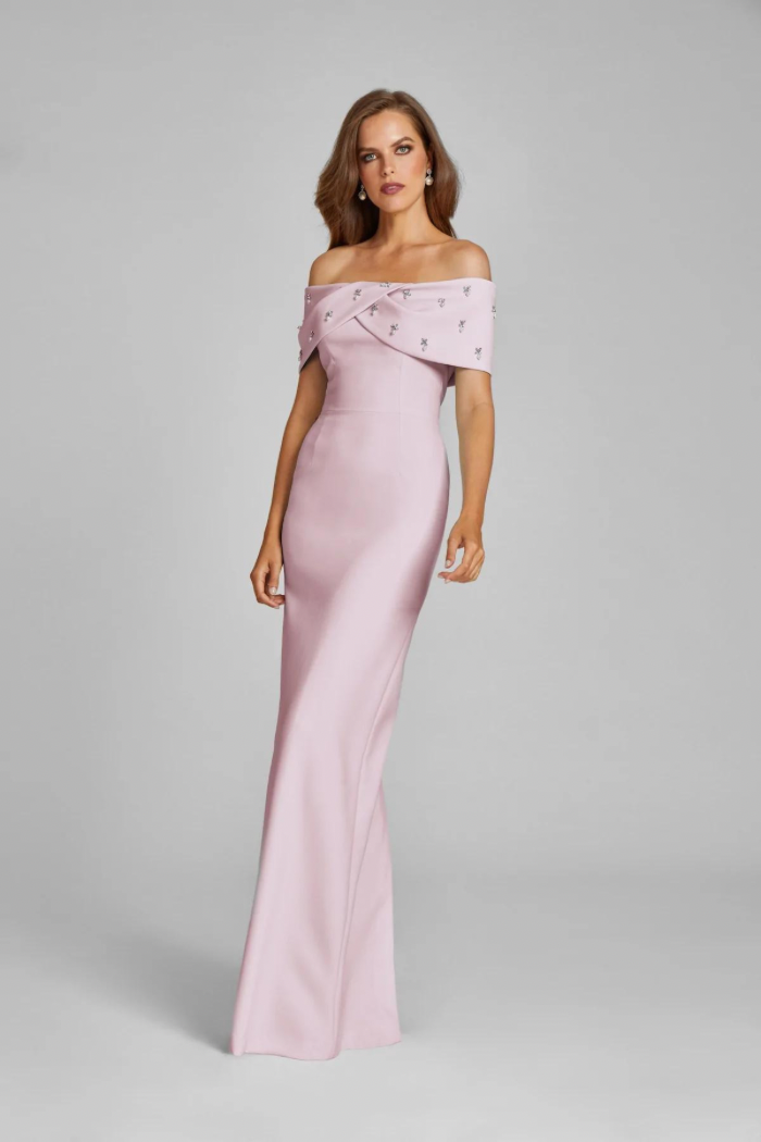 Crepe Off Shoulder Jewel Trim Portrait Column Gown