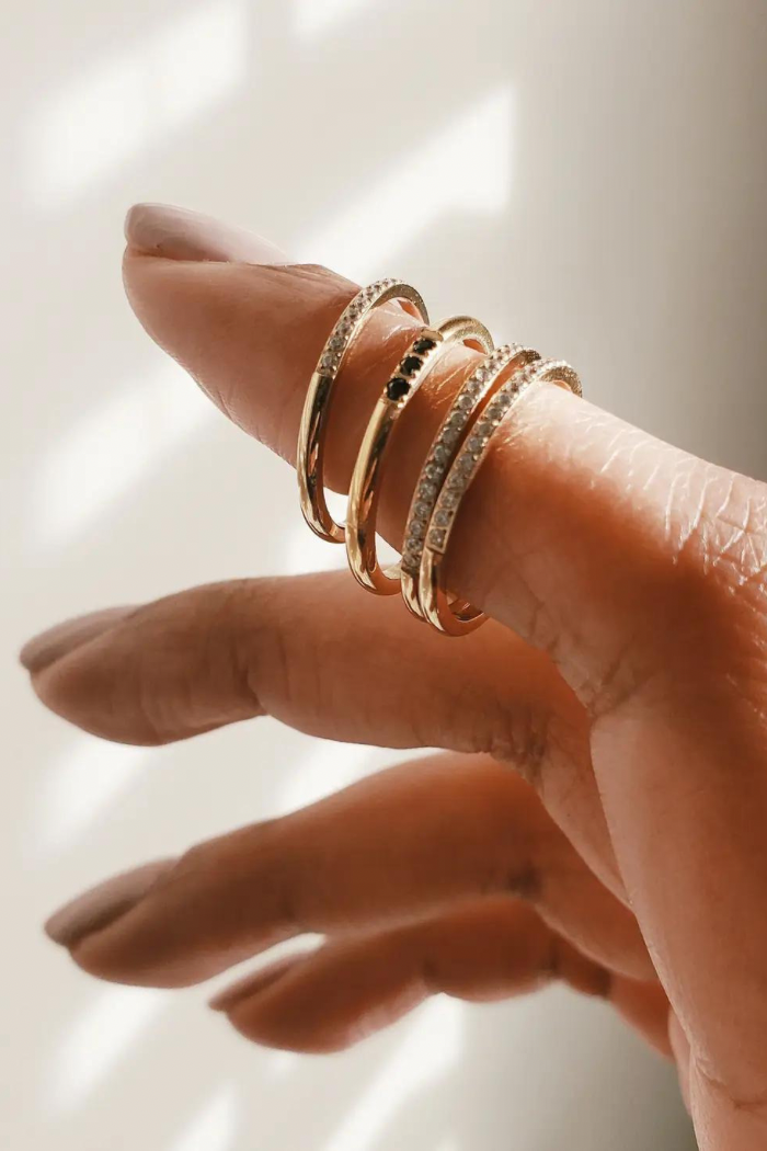 A new take on the classic stacking ring – this dainty ring features a geometric teardrop shape and a gold finish.