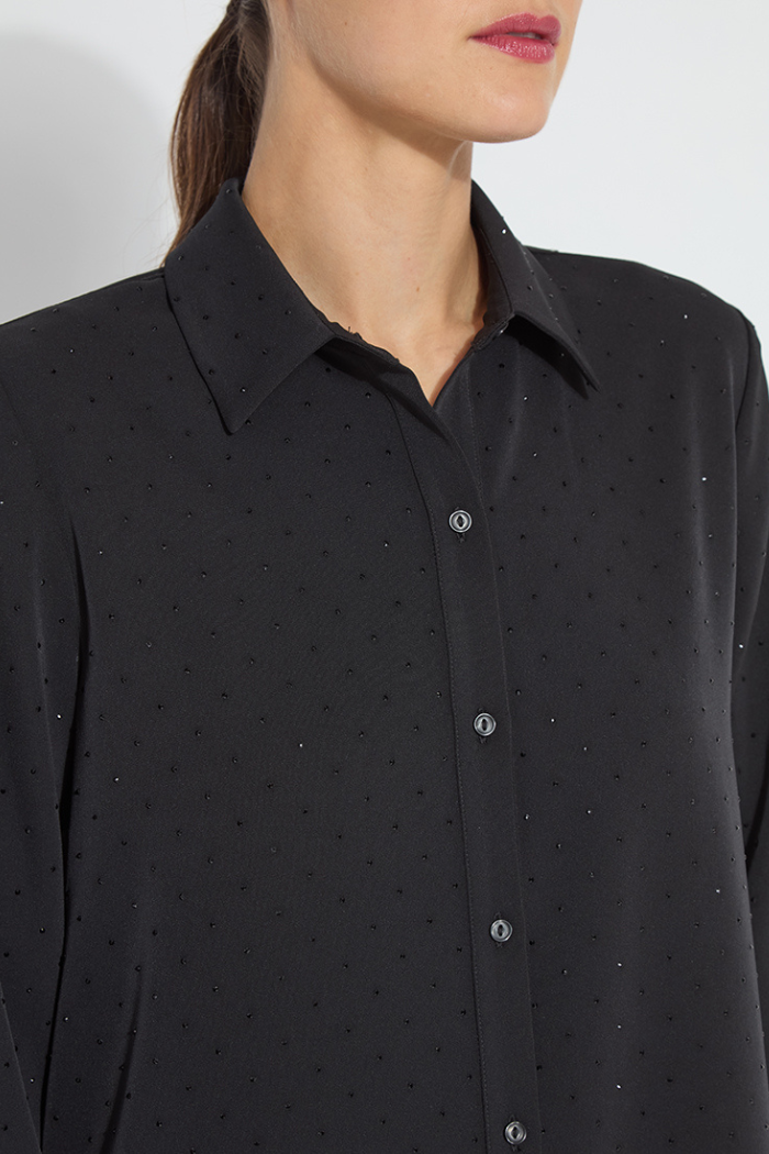 The Crystal Embellished Parker Shirt offers a slimmer fit and curved, hip-length hem that tails longer in the back than front. Made from Stretch Woven fabric, the Crystal Embellished Parker Shirt is soft and drapey. It features a shirt collar, clean cuffs, heat-sealed black crystal embellishment and a length that is perfect for tucking into wide- and boot-leg pants.