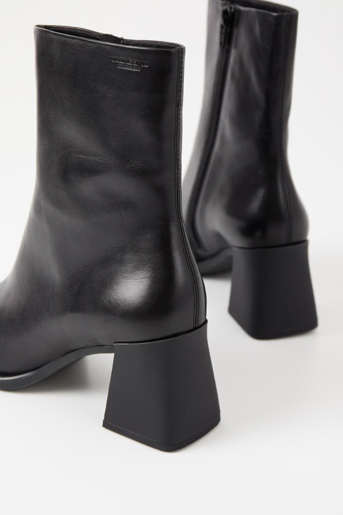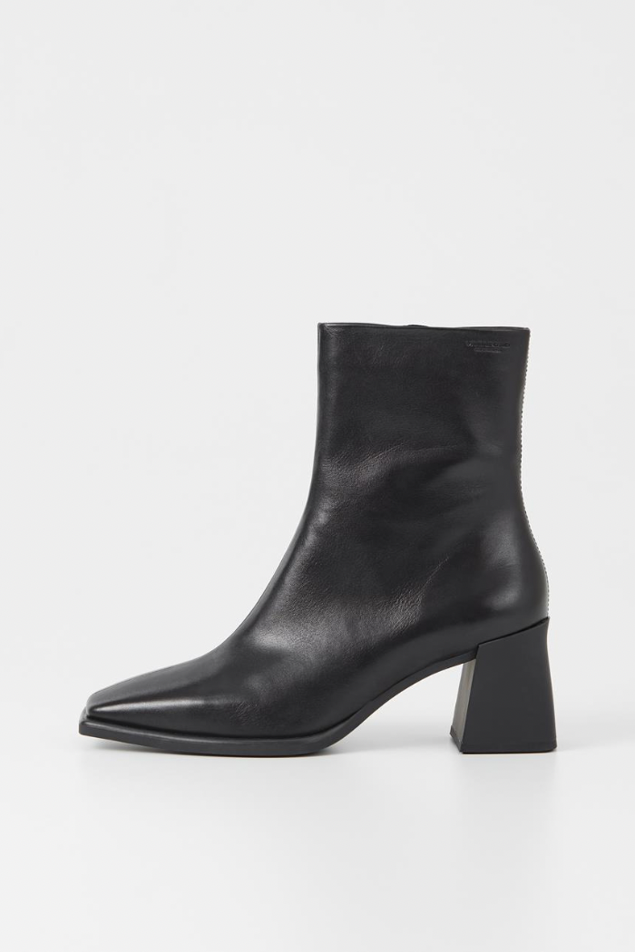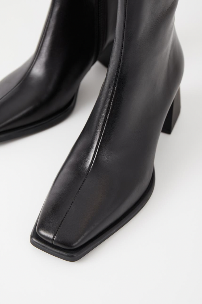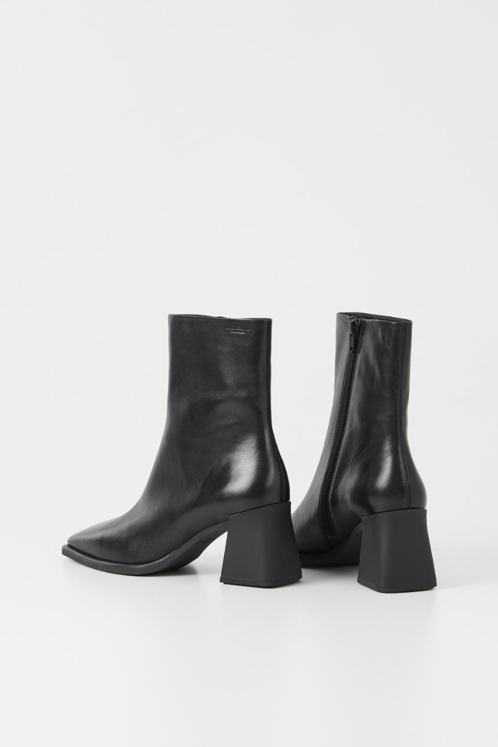 Modern ankle boots Hedda bring a retro aesthetic. The style is crafted in smooth black leather featuring square toes, a mid-rise shaft and inside zippers. The flared heels measure 70mm.