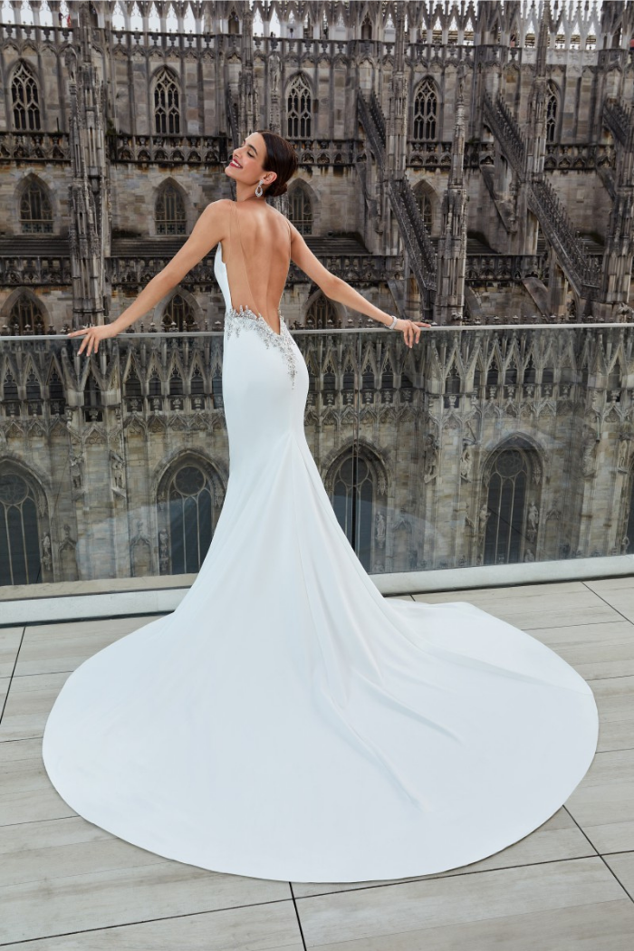 This sleek and sultry Crepe creation features a plunging sculptured V-neckline and straps that transition into a seductive, sheer, natural illusion, low back. Magnificent, intricate beading highlights the waist and cascades into the V-back. The luxurious flared Chapel train adds a touch of drama.