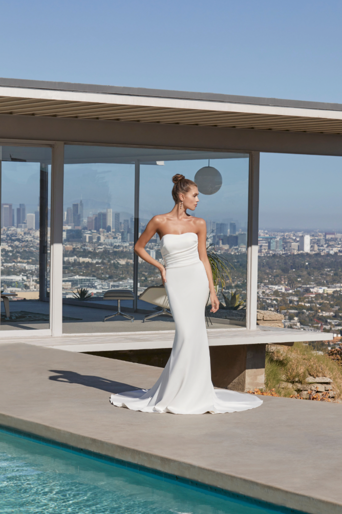 As timeless as it is contemporary, Style LE122 Edie by LeBlanc is a masterpiece of elegantly draped (insert fabric here) in a sheath silhouette with a modified sweetheart strapless neckline. Delicate buttons trail down the back of the bodice, before transitioning into a sweeping 75' train.