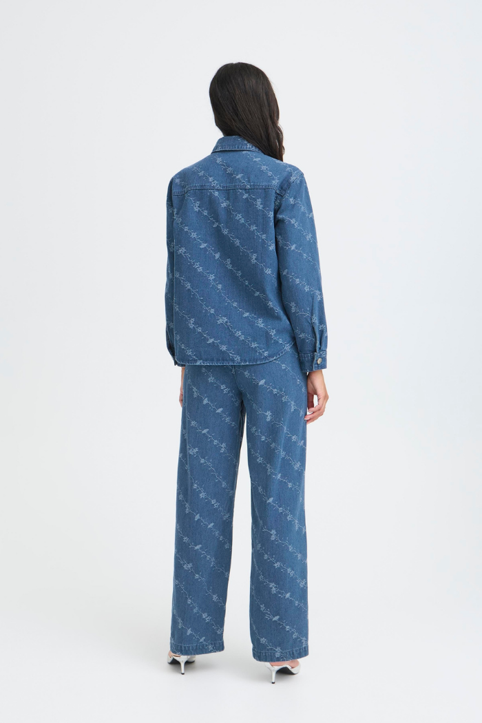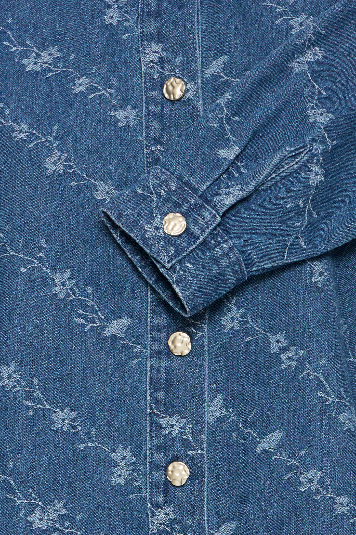 Design Details | Delicate diagonal floral embroidery, hammered-metal buttons, classic collar, medium-wash blue