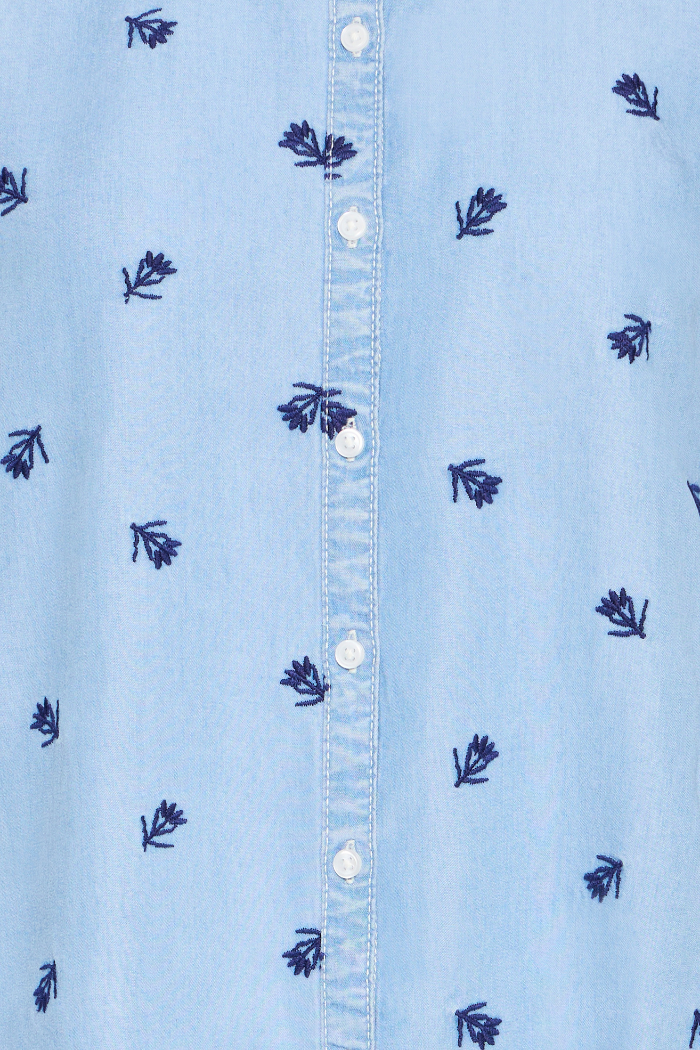 Design Details | Intricate floral embroidery, button-front closure, polished collar, button cuffs, light blue wash