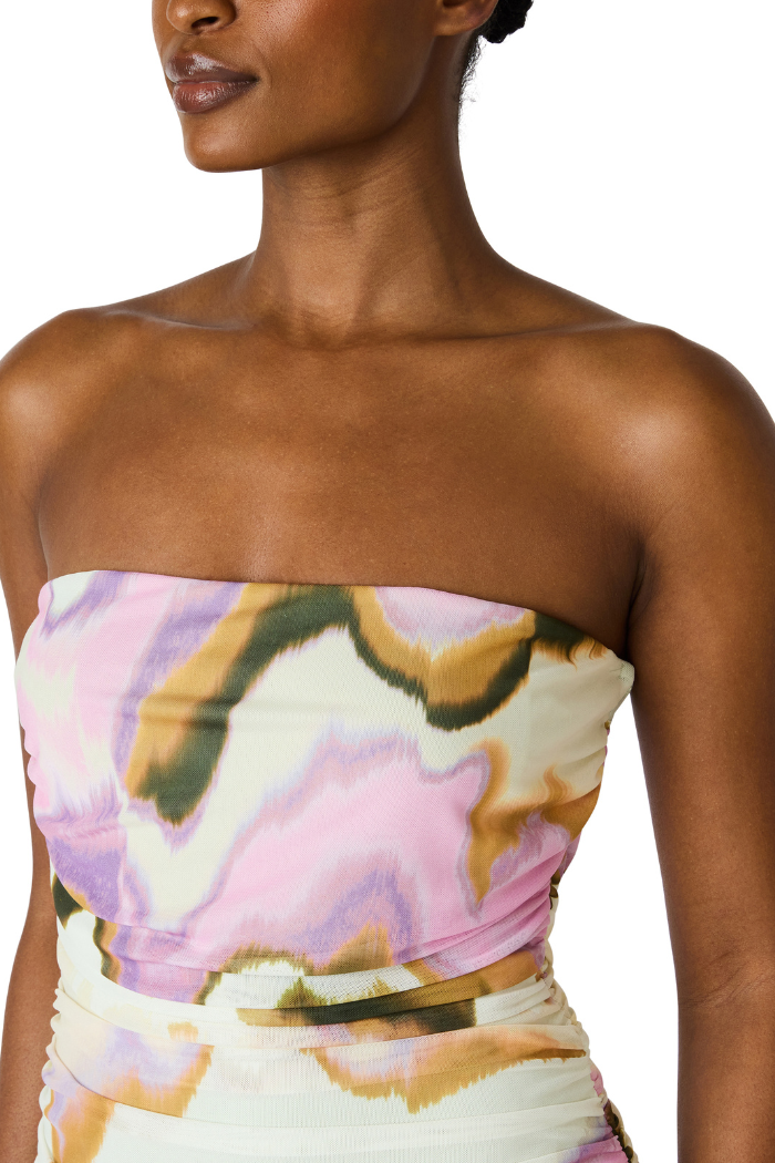 Elevate your summer wardrobe with the Steve Madden Kerrie Dress, a breathtaking strapless maxi designed to turn heads. Featuring a vibrant, abstract multi-color print and a daring thigh-high slit, this flowy masterpiece blends effortless elegance with a bold, contemporary edge. Perfect for upscale beach vacations, summer weddings, or sunset cocktails.