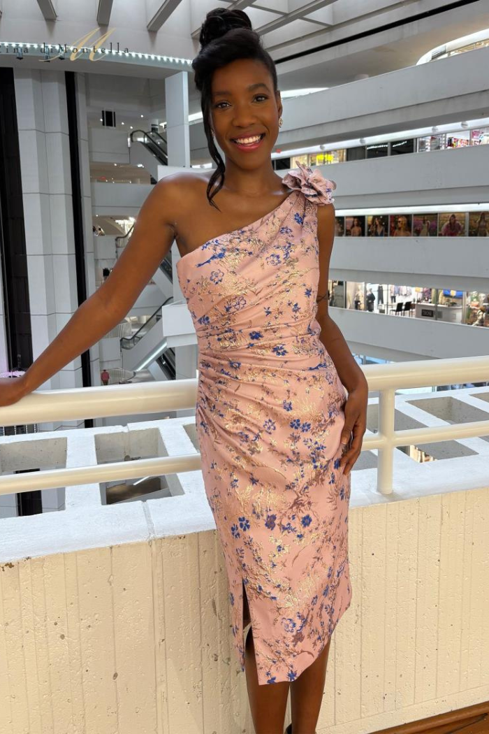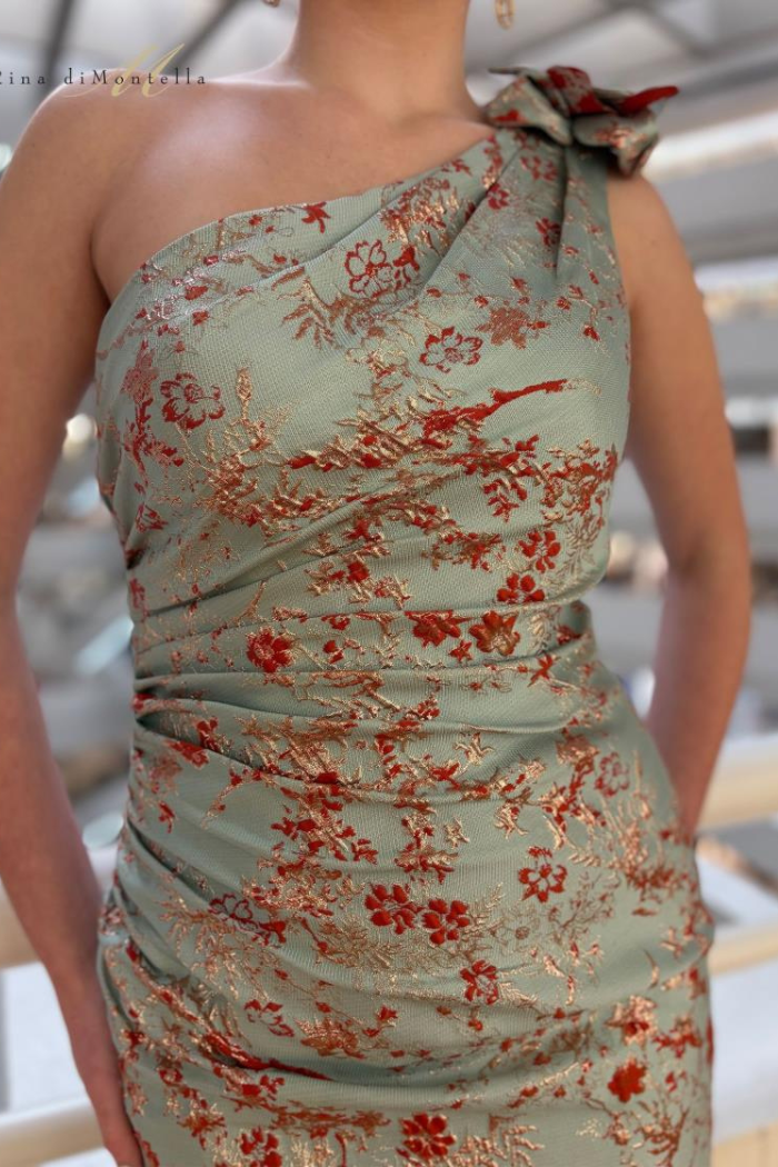 This playful one-shoulder dress features luxurious jacquard fabric and flattering ruching at the waist to highlight your silhouette. Its fun, unique print adds a lively touch, making it perfect for wedding guests or the mother of the bride. The knee-length cut balances elegance with comfort for a memorable occasion.