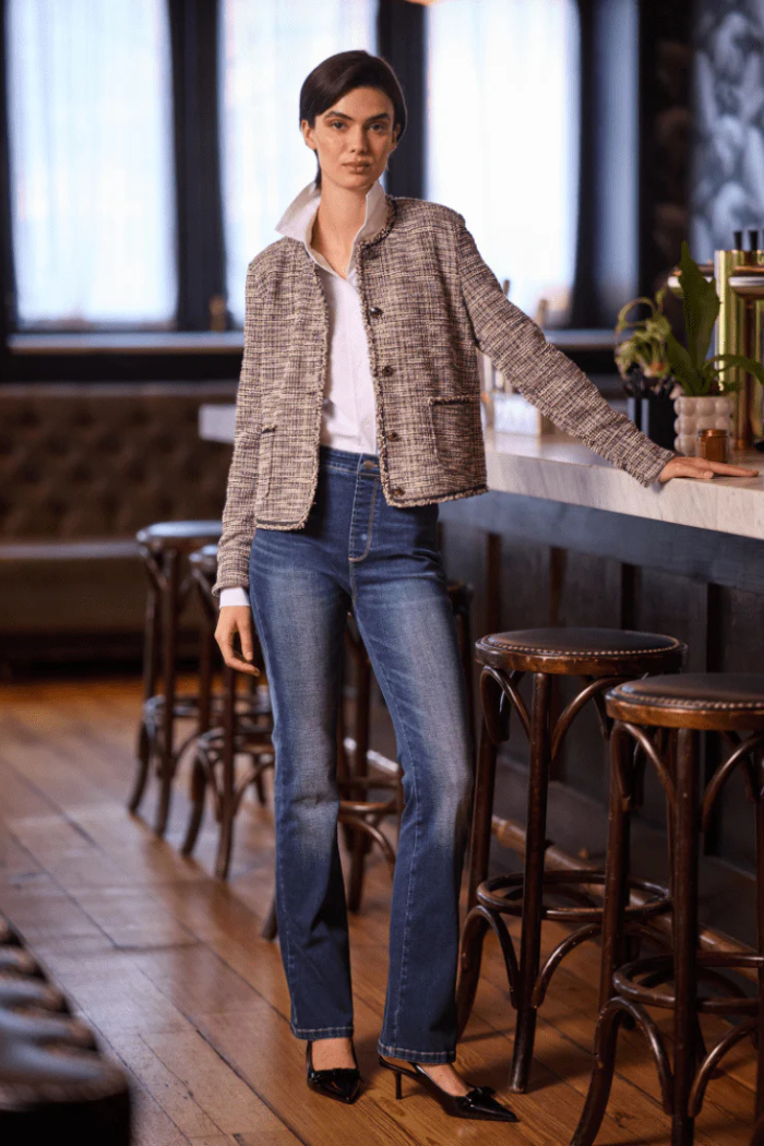 • Elevate with the Charlotte Collarless Tweed Jacket for an office-ready look.