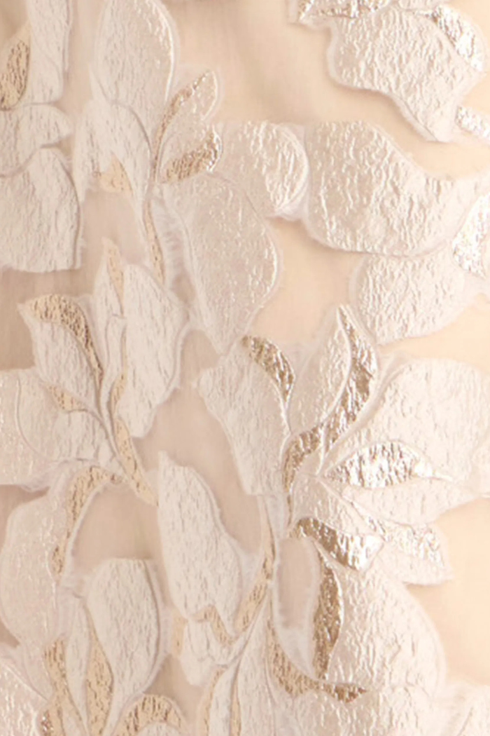 The embroidered fabric has a luxe feel but remains balanced and comfortable for formal events.