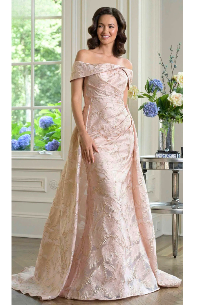 Marsoni MV1382 Jacquard Off-Shoulder Gown with Detachable Overskirt