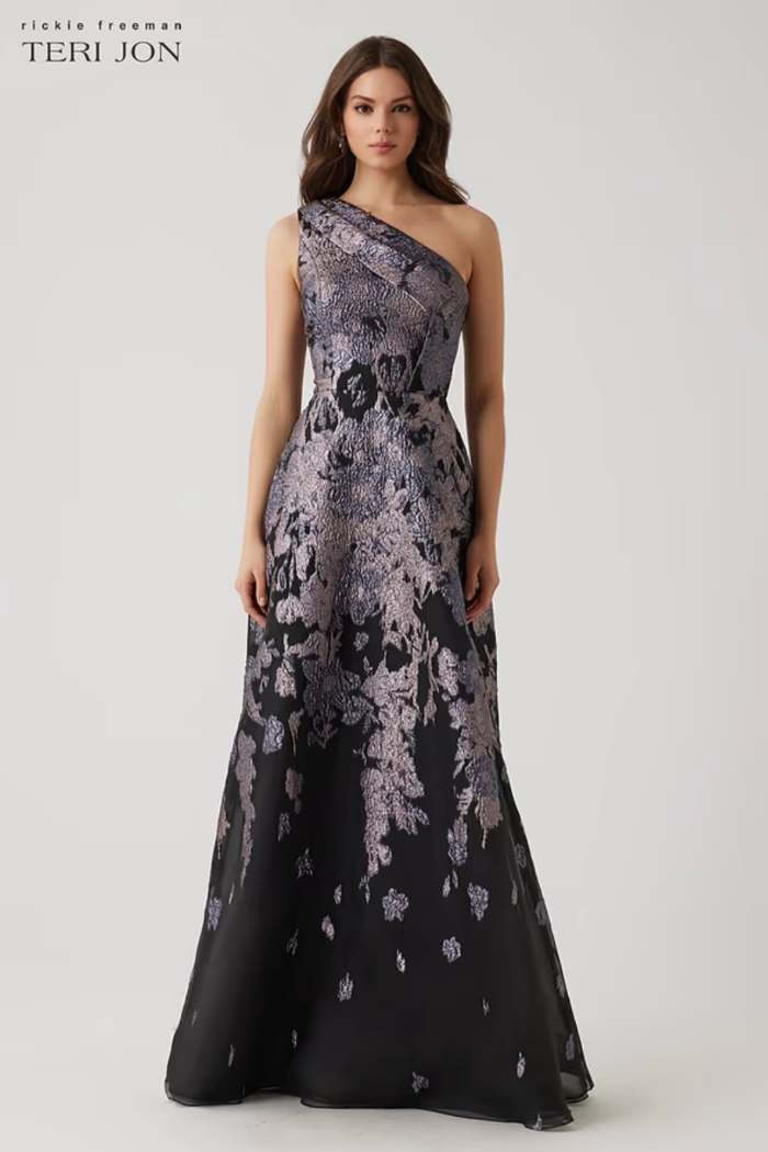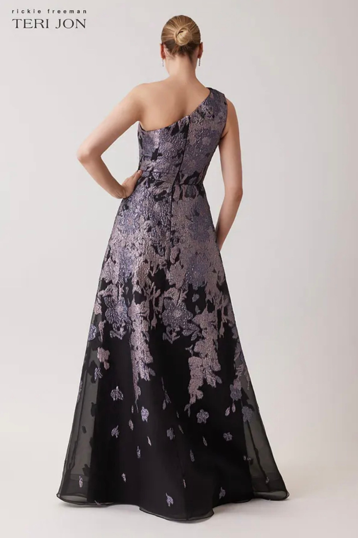 Floral Metallic Jacquard Pleated One Shoulder Gown