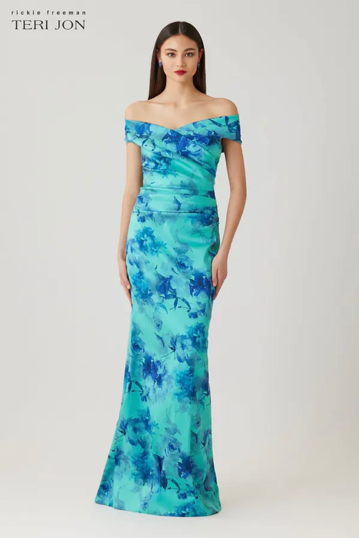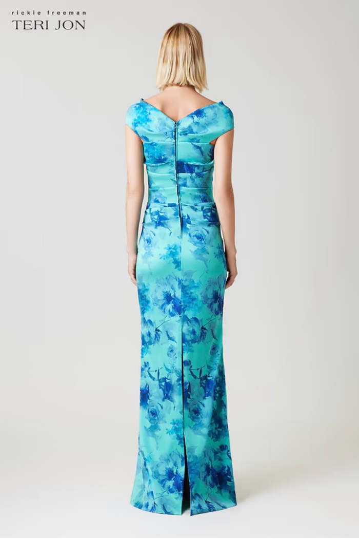 Command attention in this breathtaking stretch gazar gown, featuring a vibrant aqua floral print that captures the eye. The off the shoulder neckline pairs beautifully with delicate cap sleeves, while the ruched bodice creates a flattering, sculpted fit. Flowing to a floor length hem, the column silhouette offers timeless sophistication with a modern edge. Perfect for destination weddings or formal evening events where color and grace take center stage.