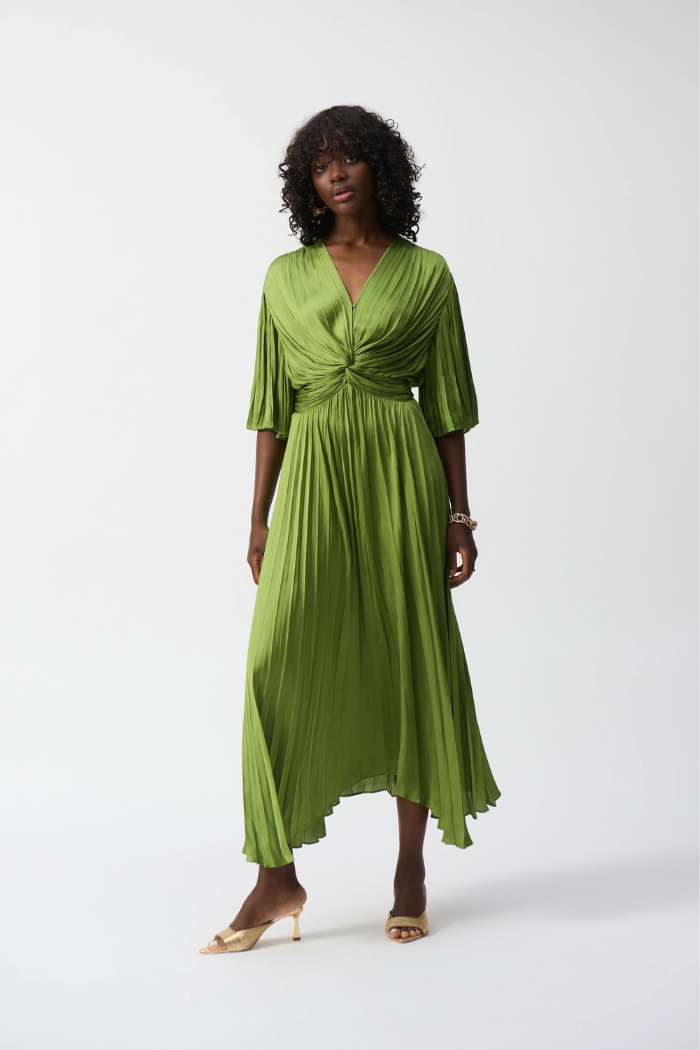 Crafted from a divine woven satin this midi dress pairs soft pleated elbow sleeves with a flowy trapeze silhouette. A knotted waist detail adds oomph and definition, while a lovely v-neck complements the decolletage.