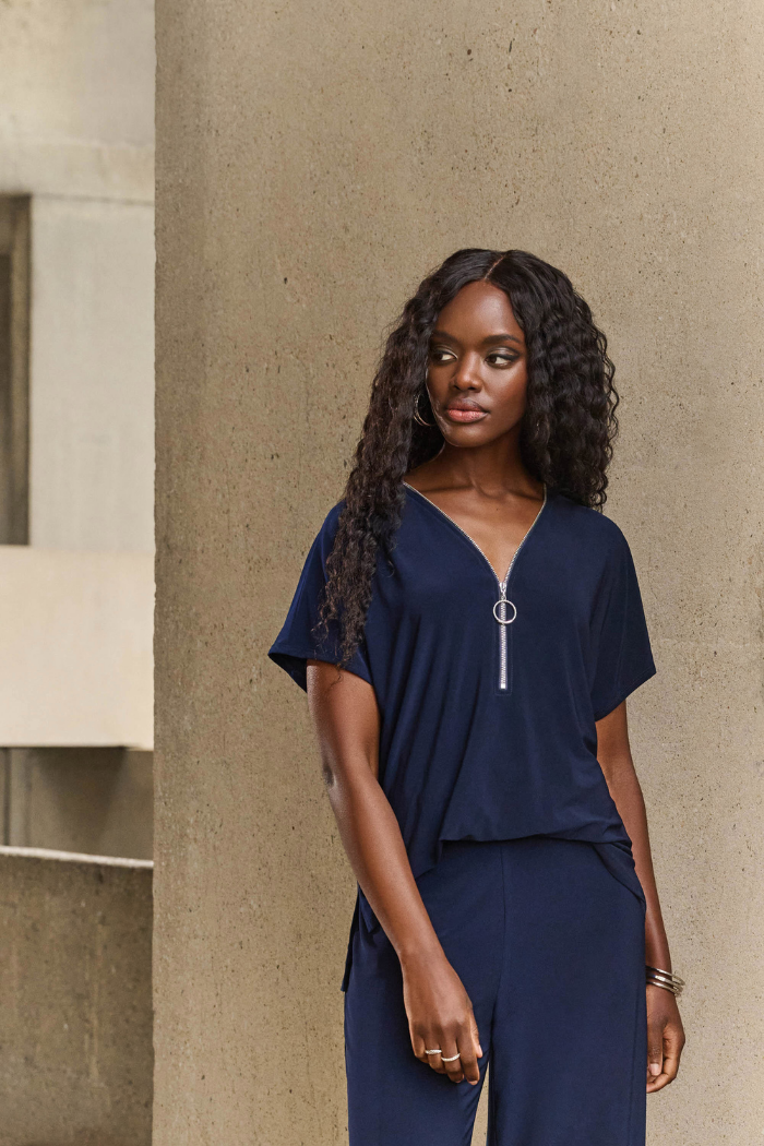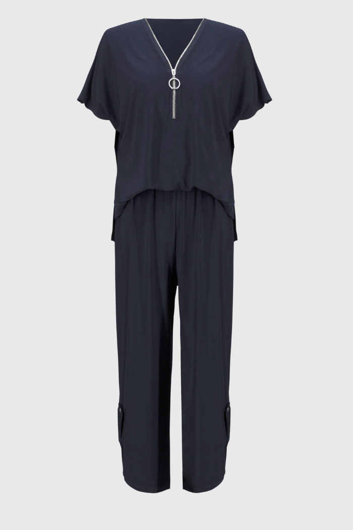 Revel in the exquisite craftsmanship of this silky knit jumpsuit. This modern design is tailored in a chic culotte silhouette featuring a sleek tab and button detail at the bottom of the leg for extra flair. A bold zipper graces the neckline while the short dolman sleeves lend a polished look.