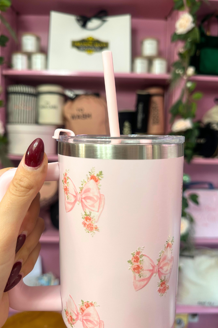 Introducing the Girly Tumbler - the perfect combination of coquette style and functionality! Made of stainless steel and featuring a whopping 40 oz. capacity, this tumbler is perfect for enjoying hot or cold beverages on the go. And with its adorable bows, it's sure to make a statement wherever you use it. Get yours today and add some girly flair to your drinkware collection!