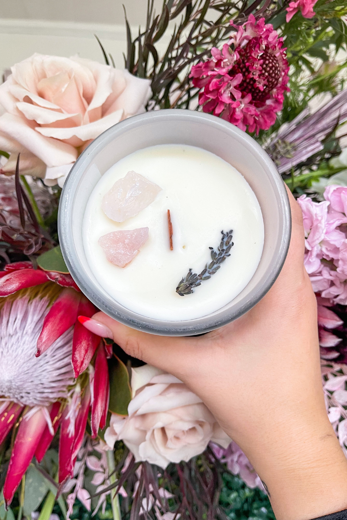 This is the first of many scents we plan on creating, which is why we named it No. 1. This blend has a base of amber and notes of oak moss, lavender and driftwood. It is finished with a wide wooden wick for long burns and topped with rose quartz and lavender.  Perfect for year-round use. Whether you burn it or leave the top off, the scent will fill your space.