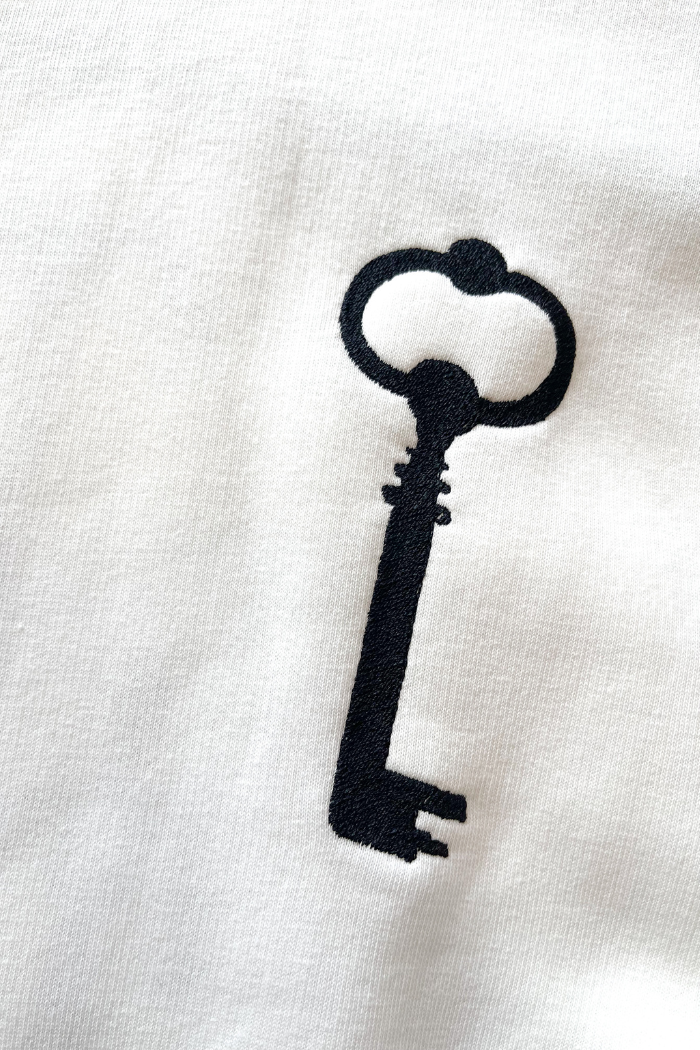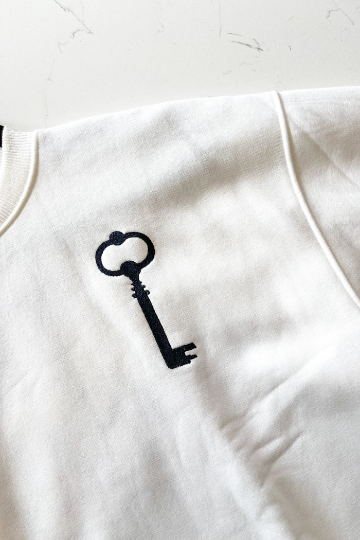 When we're not in our favorite outfit, we're in our favorite sweats. The first of many custom merch drops is finally here and we designed it with our Girl Gang in mind. This custom sweatshirt is made from a premium cotton blend by the same suppliers of some of your favorite luxury loungewear brands. It's the perfect weight to wear across all seasons, super soft on the inside and in neutral white with bold black embroidery that will match anything. Each sweatshirt is made with our signature key embroidered on the front, with our exclusive logo embroidered on the bag in the perfect oversized fit.