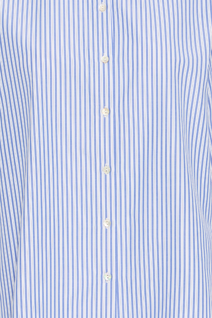 Design Details | Sporty side tape trim, light blue vertical stripes, curved hemline, button-front closure
