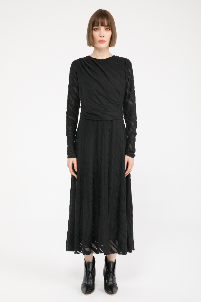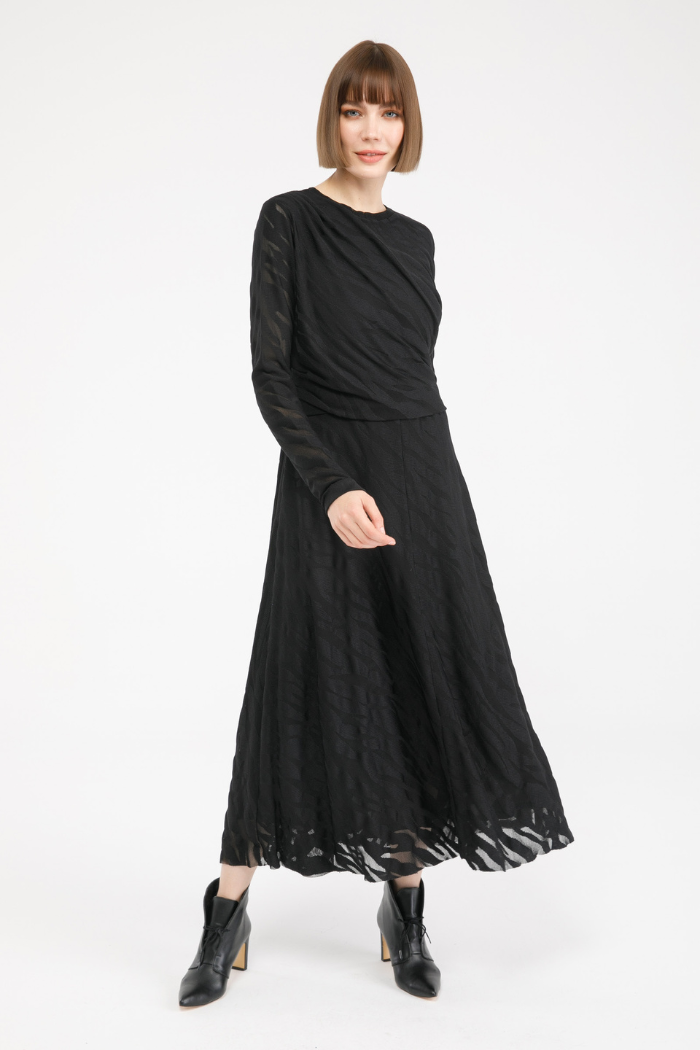 This dress is just what your wardrobe needed. Made from a light and comfortable mesh fabric in a subtle zebra print, the midi length is timeless and chic for anyone at any age and can easily be dressed up or down.  The a-line fit is flattering on all and features light long sleeves making it the perfect piece to add layers to. This dress is very true to size and features the perfect stretch to fit your body type!