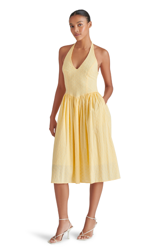 The Steve Madden Ressi Dress in Butter Yellow is the perfect way to embrace the season’s most sought-after color for spring and summer 2025. This soft cotton eyelet midi dress features a flattering halter neck and a relaxed drop waist, creating a feminine silhouette that is as comfortable as it is stylish. The delicate eyelet fabric adds texture and sophistication, making it an ideal choice for any occasion.