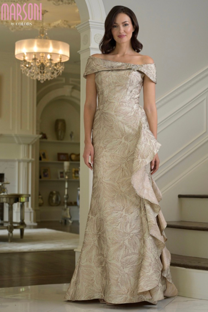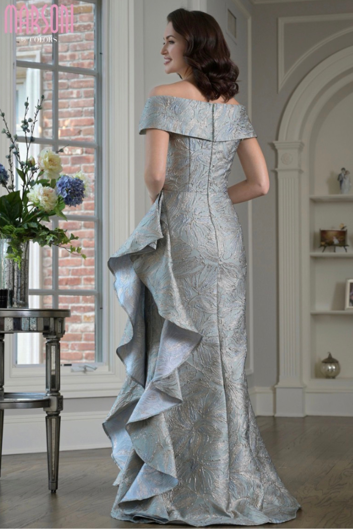 Make a refined statement in the MV1381 by Marsoni, an elegant off-shoulder metallic jacquard gown designed for unforgettable formal occasions. Crafted in a luminous jacquard fabric with subtle metallic sheen, this gown offers timeless sophistication with a modern edge, creating a polished and graceful silhouette.