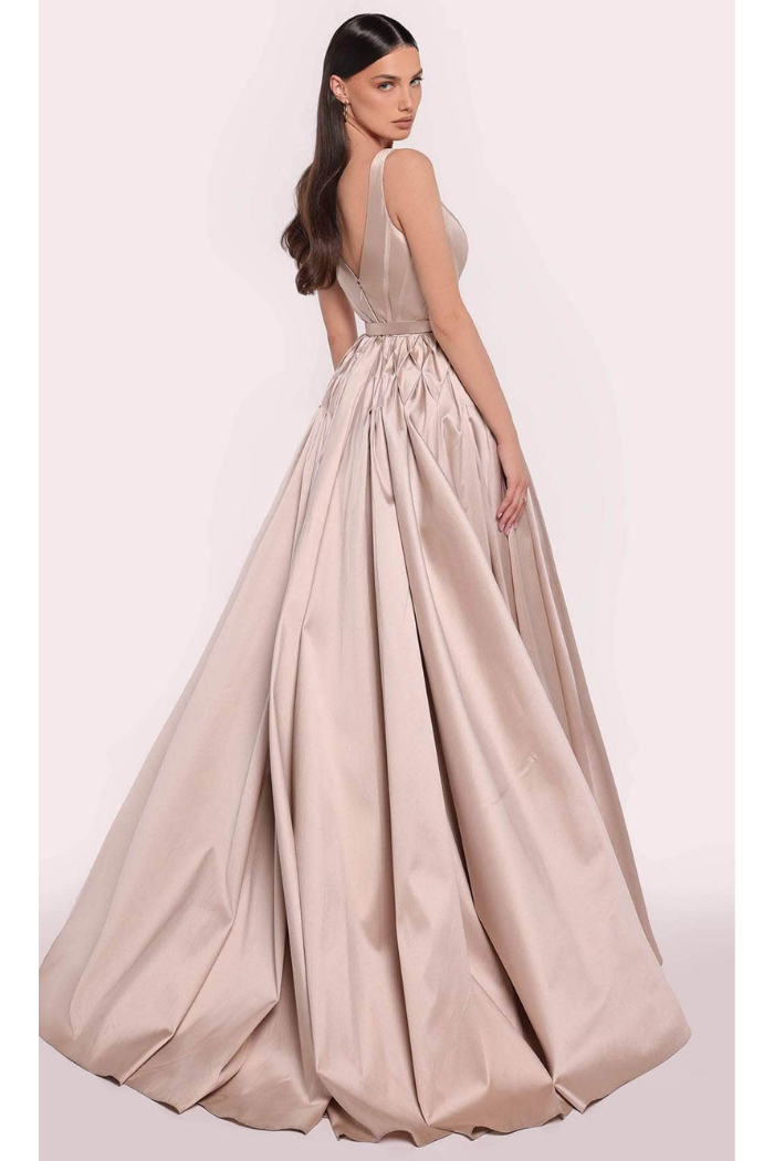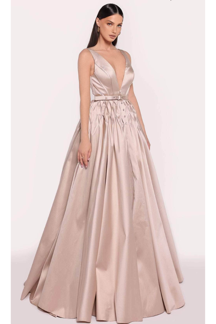 Gracefully don this fabulously designed Tarik Ediz 98732 masterpiece. This exquisite evening dress, crafted from luxurious taffeta, is a testament to meticulous craftsmanship. Its tailored lines sculpt your silhouette, while the sleeveless bodice and plunging V-neckline create a captivating allure. The button-down accent and tonal belt around the waist add a touch of sophistication. The A-line skirt, adorned with diamond-weaved accents and pleats, flows gracefully into a sweeping train. This Tarik Ediz 98732 creation is the perfect choice for those seeking a gown that exudes modern sophistication and style for any formal occasion.