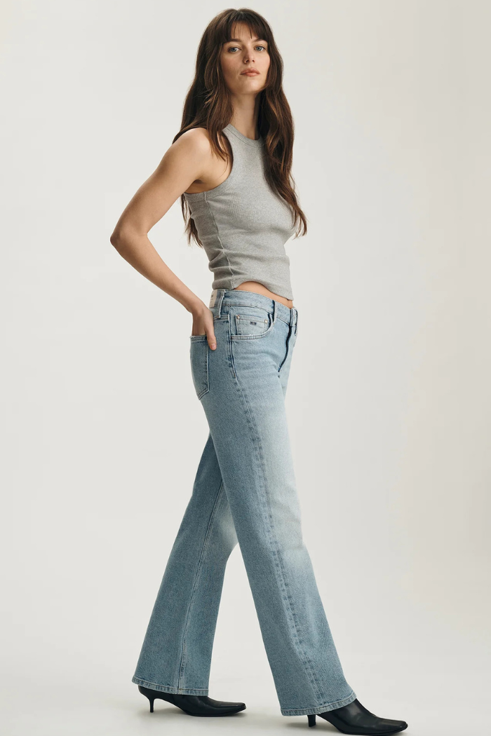 Design Details | Low rise, loose straight leg, relaxed fit, lived-in light blue wash, classic five-pocket styling, 30" inseam