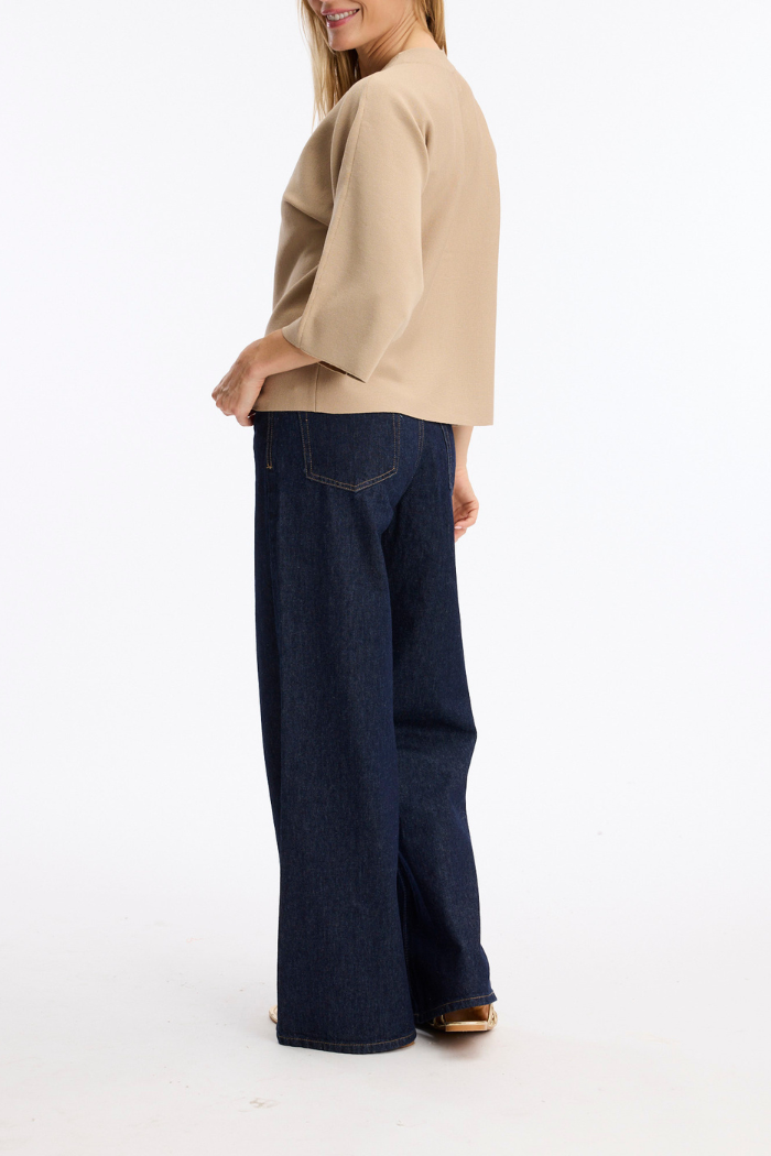 Design Details | Deep plunging V-neckline, structured shoulders, wide 3/4-length bell sleeves with flowing drape, two large gold coin buttons at center front, cropped straight hem, warm beige