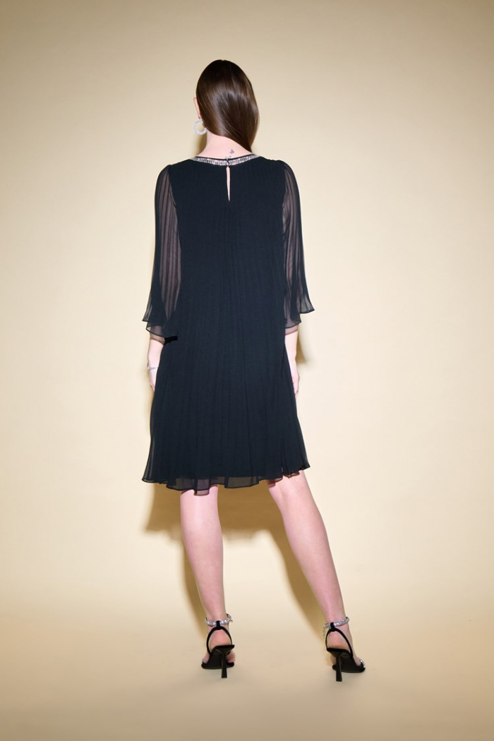 This chiffon dress exudes sophistication and confidence. Lightweight and flowy, it's framed by a crew neck and three-quarter pleated sleeves that perfectly fall at the knee. Lined for extra comfort, this timeless trapeze dress is ideal for special occasions. Part of the Signature Collection.
