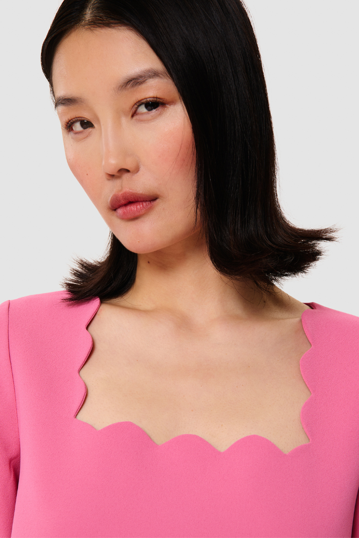 The Rossie Dress by Tara Jarmon is your go-to piece for any spring occasion. This pink long-sleeve shift dress features a delicate scalloped neckline, blending elegance with charm.