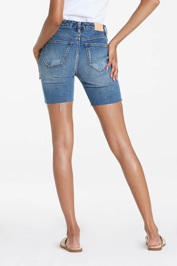 Classic bermuda denim super high rise shorts. It's the true fit that sits at natural waist and fitted in the hip and thigh. Shorts inseam on comfort stretch denim accented with 3D whiskers at hip, pocket grinding & random abrasions, raw edge leg opening & frayed hem.