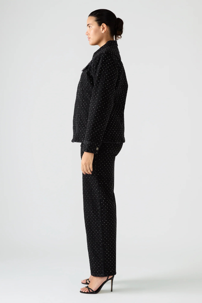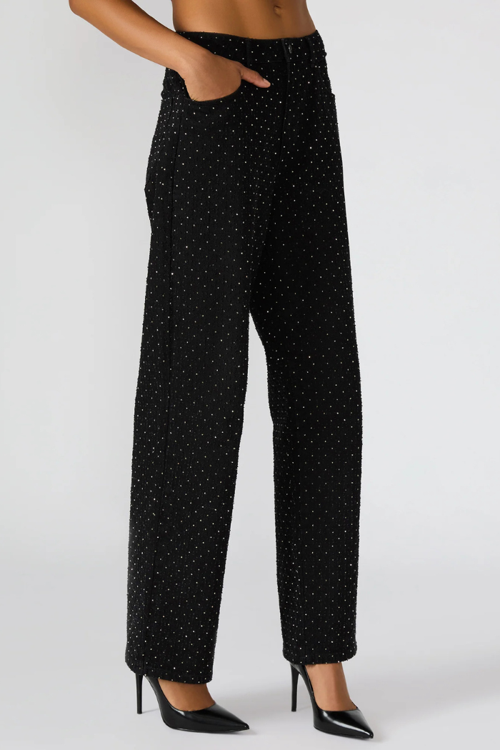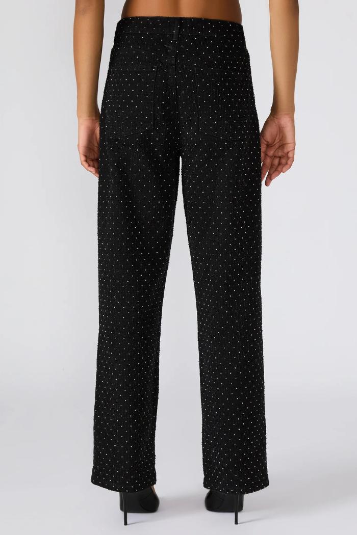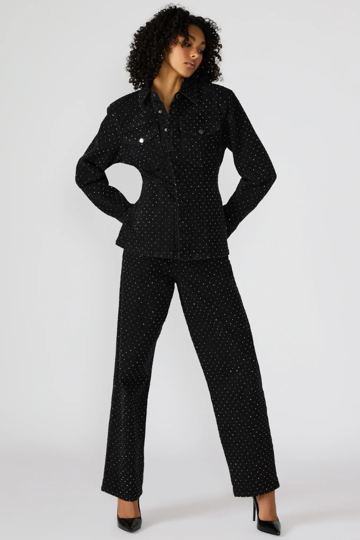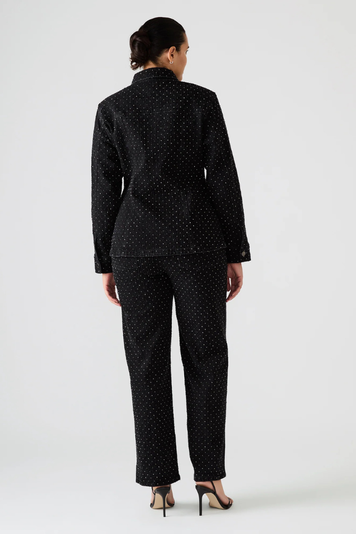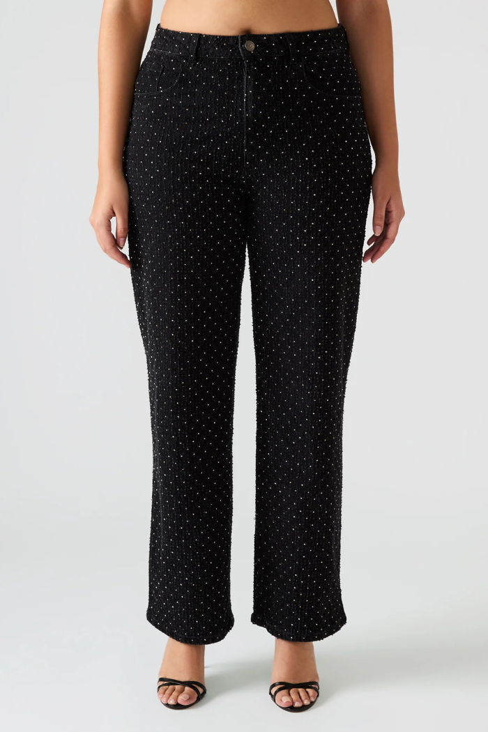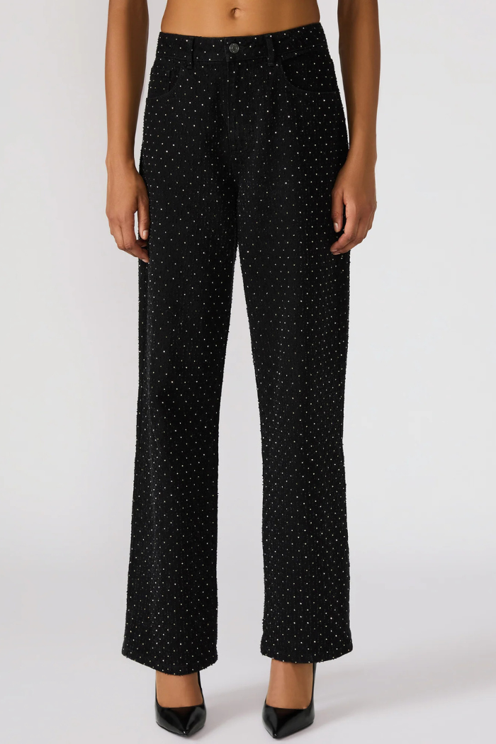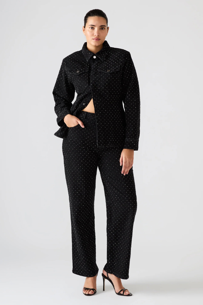 Elevate your denim game with the Avaline Crystal Jean in black — a refined twist on the classic straight-leg silhouette. Embellished with all-over crystal studs, these jeans strike the perfect balance between casual cool and understated glamour. The structured cotton blend provides a flattering fit with just the right amount of stretch, making them as comfortable as they are captivating.