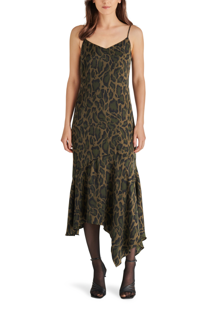 Leopard spots create a sultry camouflage on this lightweight slipdress finished with a swingy asymmetric handkerchief hem.