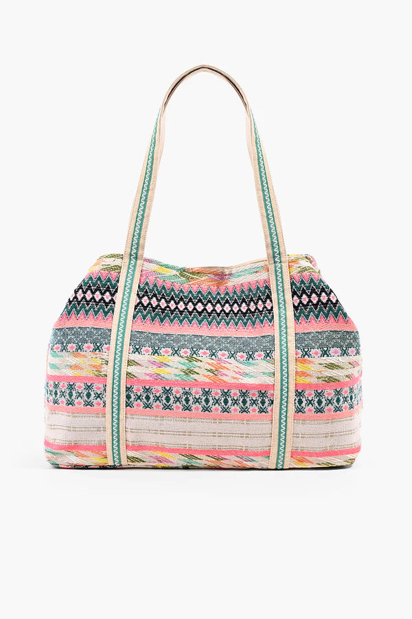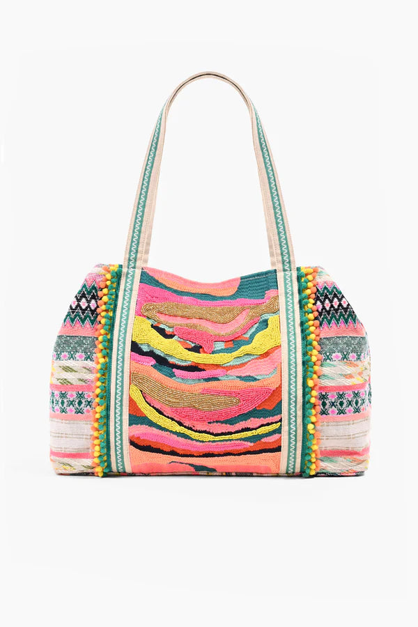 Fully hand-beaded and hand-embroidered, the Daphne wows with colors that pop in shades of turquoise, pink, and sunshine yellow. Just to be over-the-top awesome, we added sprinkles of golden sparkle and mini pom poms. Combining this amazing detail with hand-woven jacquard, this artisan bag also boasts comfy shoulder straps with hand stitched accents and internal storage including two slip pockets and one zippered pocket. With the Daphne, fashion and function team up to create a bag that has literally gone viral.
