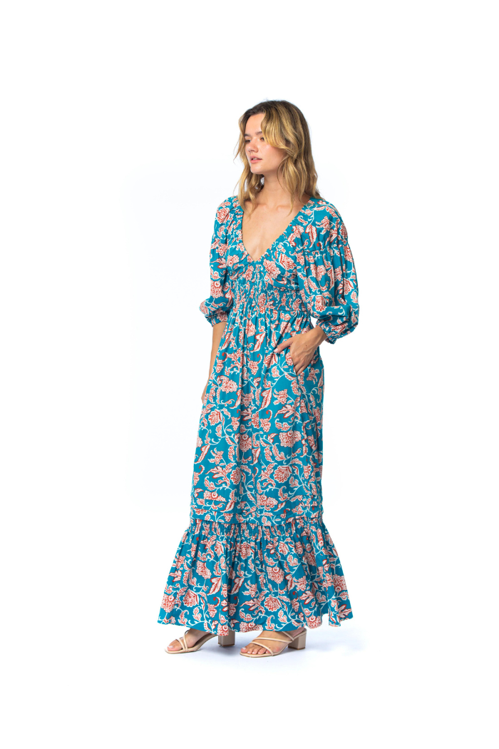 Get ready to turn heads in the vibrant print of our Sophia Dress. With a smocked waist and flattering silhouette, this maxi dress is perfect for your next destination wedding or resort vacation. The v-neck and ruffled hem add a touch of elegance, while the pockets make it practical for any vacation activity.