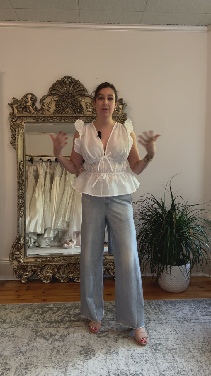 Add some feminine flair to your wardrobe with the White Loni Top. This top features charming ruffle shoulders and a flattering fitted waist, with a bow at the neckline for added detail. It's comfortable and lightweight, making it perfect for dressing up or down.