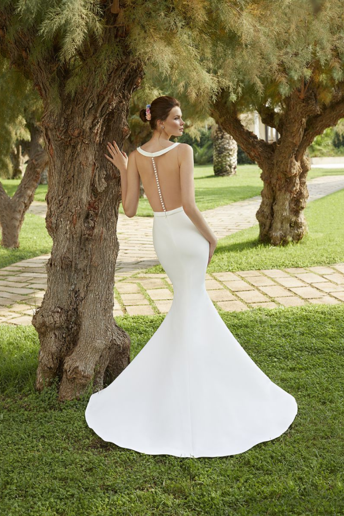 This sumptuous, Satin, Fit n flare gown features an alluring barely there natural illusion back with button closure and dramatic, plunging V-neckline. A delicate ribbon belt highlights the waist. Shown: Ivory