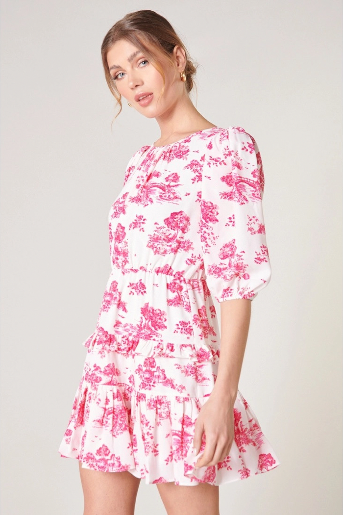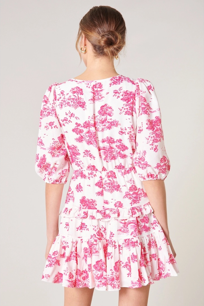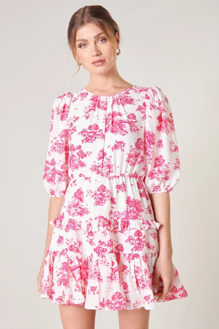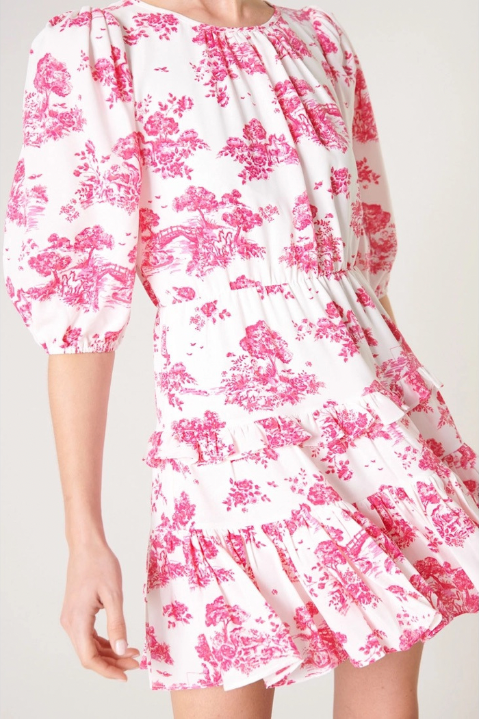 A charming meadow toile print shapes this evergreen dress. Half balloon sleeves frame a round neck with shirring along the chest. A blouson silhouette is maintained throughout the bodice where it meets an elastic waistband to create a flared skirt. Ruffles are placed at the tiered seams along the skirt, making the perfect flirty dress for tea, weddings, or a day date.