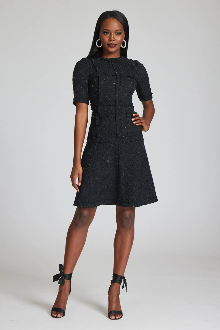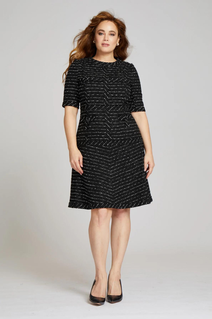 A classic day to dinner dress for all-year-round. This black and silver metallic tweed dress is perfect for an array of occasions, casual or formal. Featuring short sleeves, a knee length cut, and a jewel neckline. Flattering on all bodies, this dress is timeless and a closet staple. Pair with a black or silver pumps to complete the look. This dress is also perfect as a mother of the bride/groom going to a rehearsal dinner, shower, or a more casual wedding.
