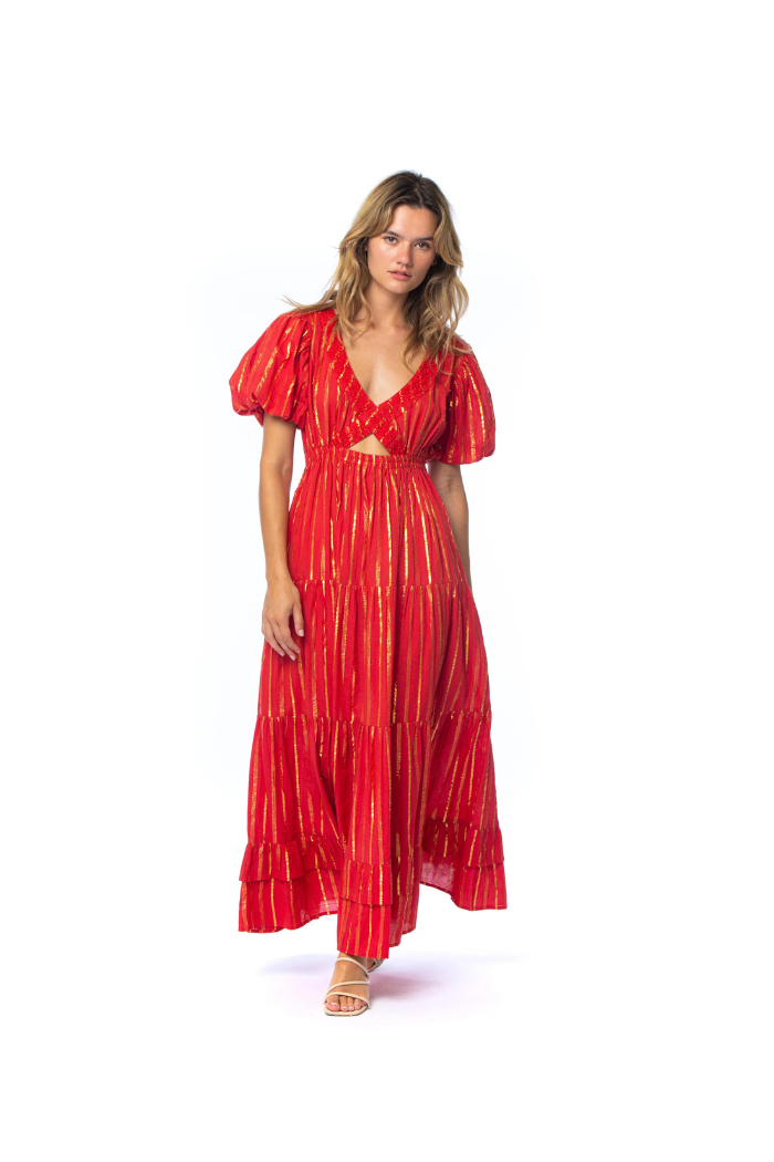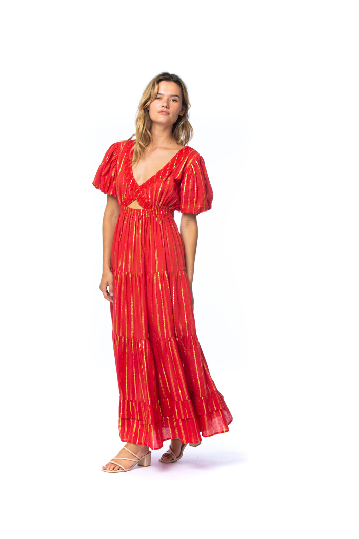 Radiant Red & Gold Stripe Tiered Maxi Dress with Puff Sleeves