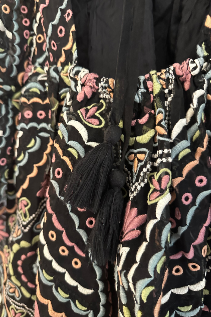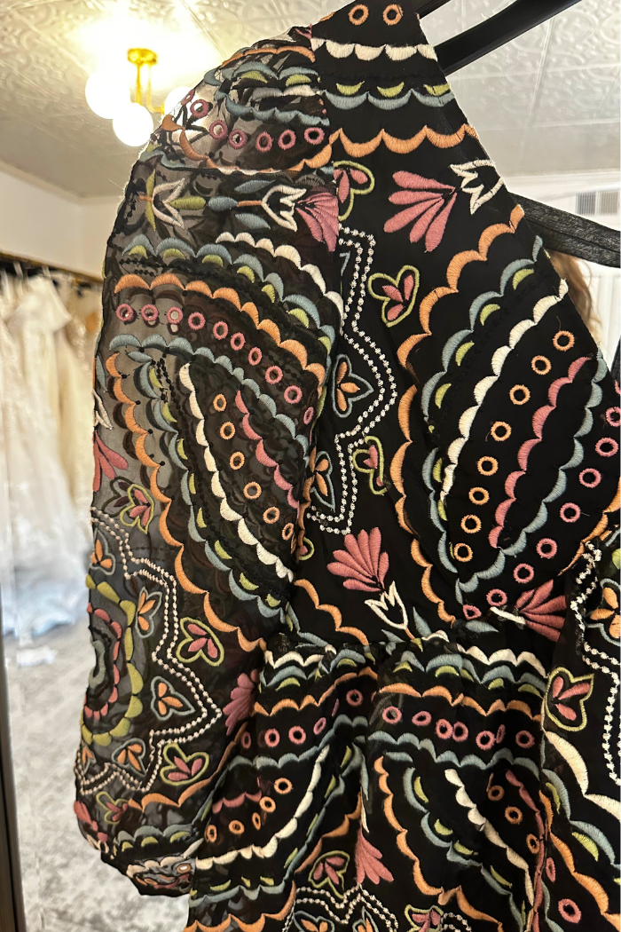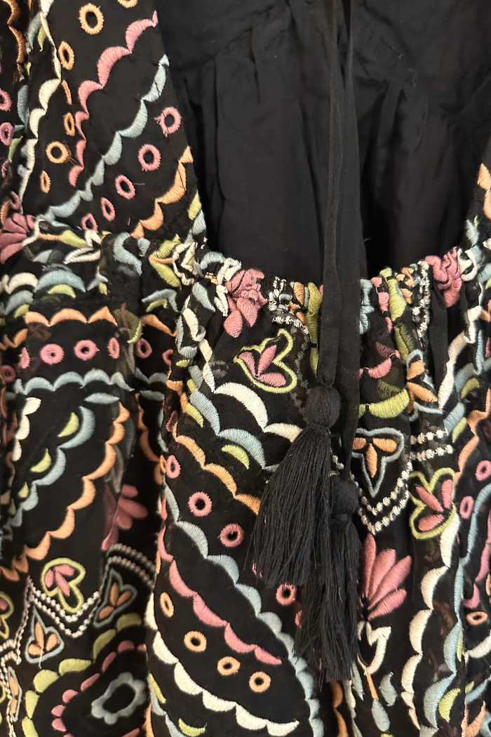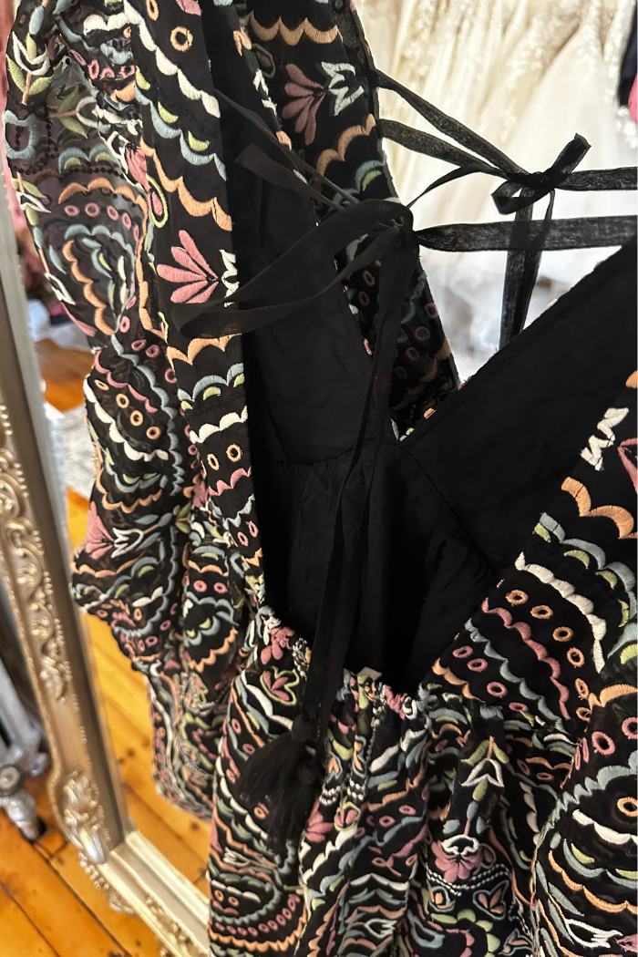 Elevate your wardrobe with our Brie Dress! This babydoll dress features a flattering v-neck, open back, and sheer puff sleeves. The tassel tie in the back adds a touch of bohemian style while the vibrant embroidered fabric adds a pop of color. Its lightweight design and fit and flare silhouette make it perfect for year-round wear. From winter with black tights and boots to spring and summer with sneakers, sandals, and heels, this dress is versatile and stylish. Order now and experience its effortless charm!
