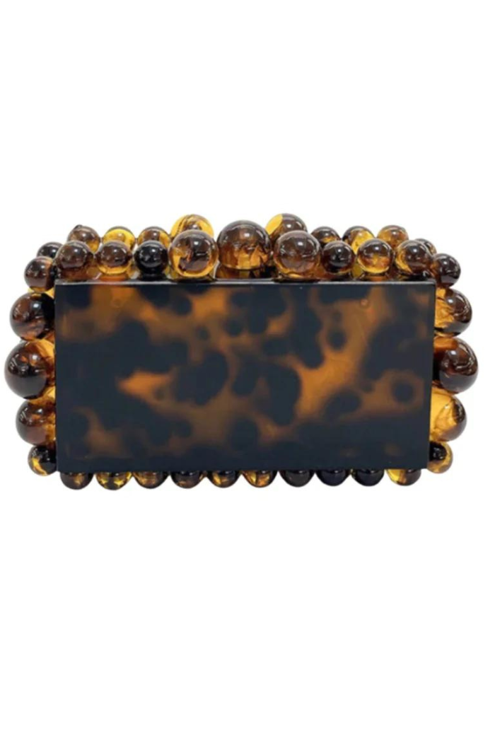 This clutch is a stunning and sculptural accessory, crafted in a captivatingly marbled acrylic with a resin trim. Beads surround the edges of the bag for a sophisticated and balanced touch. Be the life of the party with this head-turning bubble clutch. It's an eye-catching, unique accessory that will add a touch of sparkle to any outfit. Forget being one in the crowd - this dazzling gold clutch will make you the star of the show!
