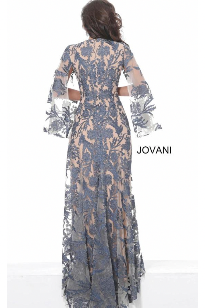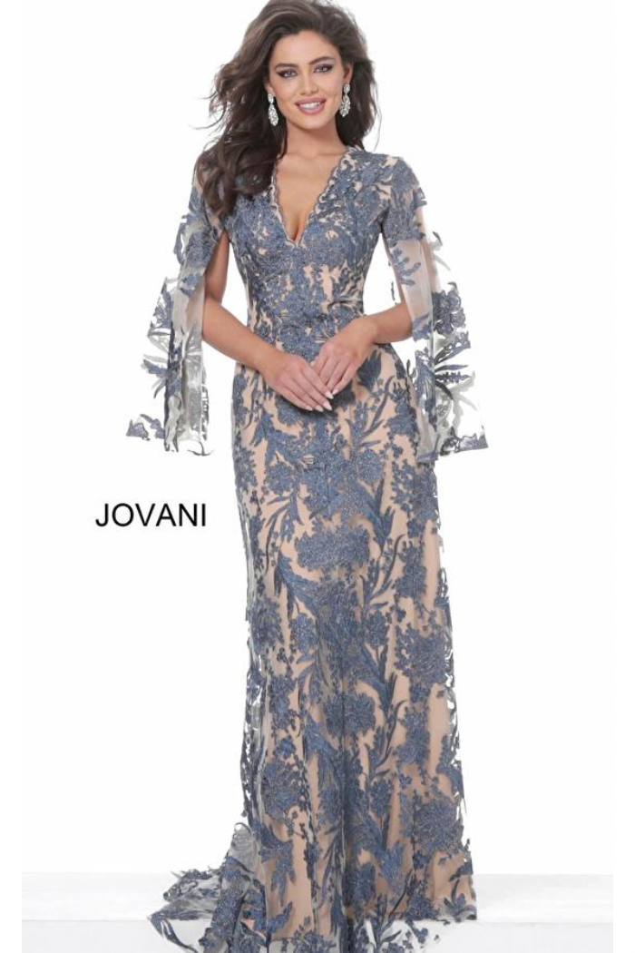 You will truly shine in this tantalizingly elegant Jovani (Style 00752) creation. With a tailored nude lining, this beauty shows off a plunging v-neckline with scalloped edges. Draped with floral rendered novelty lace, the bodice is framed with long cape sleeves. A zipper closure accents the full back. Back godets grace the full-length sheath silhouette as it falls into a sweeping train. Make this night worth remembering with this Jovani masterpiece.