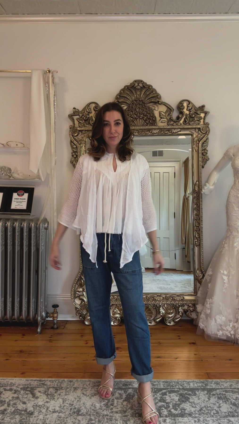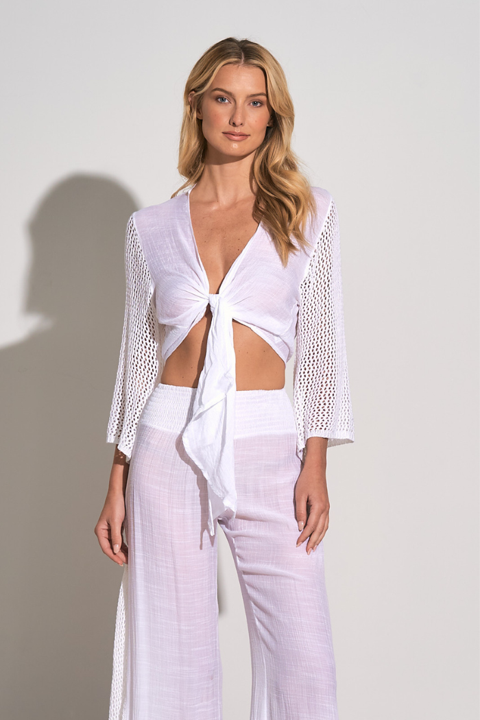 Add a playful touch to your summer wardrobe with the Corinne Top. This multipurpose piece features a cropped wrap design that can be tied in the front or back. Its light weight gauze cotton material is perfect for staying cool on hot days. The crochet sleeves and detailing add a quirky and fun element to this summer staple.