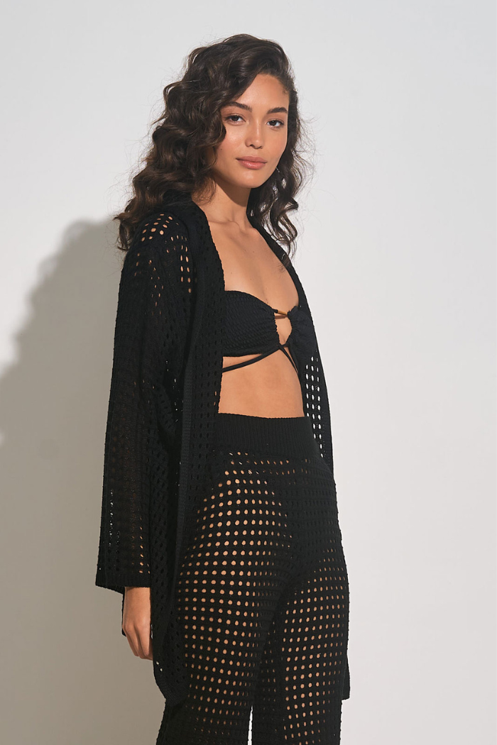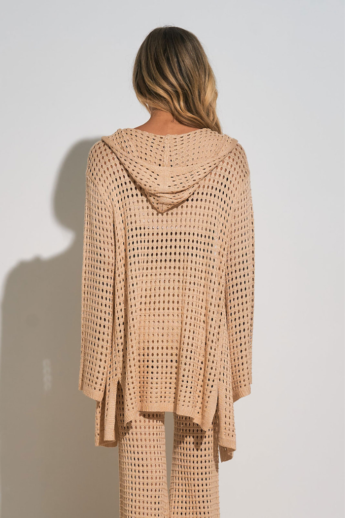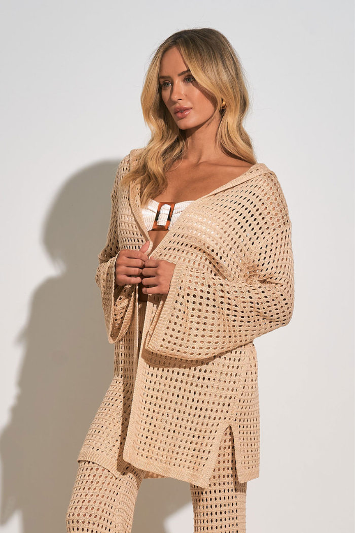 One of our all time seasonal best sellers! A resort favorite, the Cove woven hoodie adds a boho touch over any bikini or swimwear. Featuring an open front and airy sleeves.