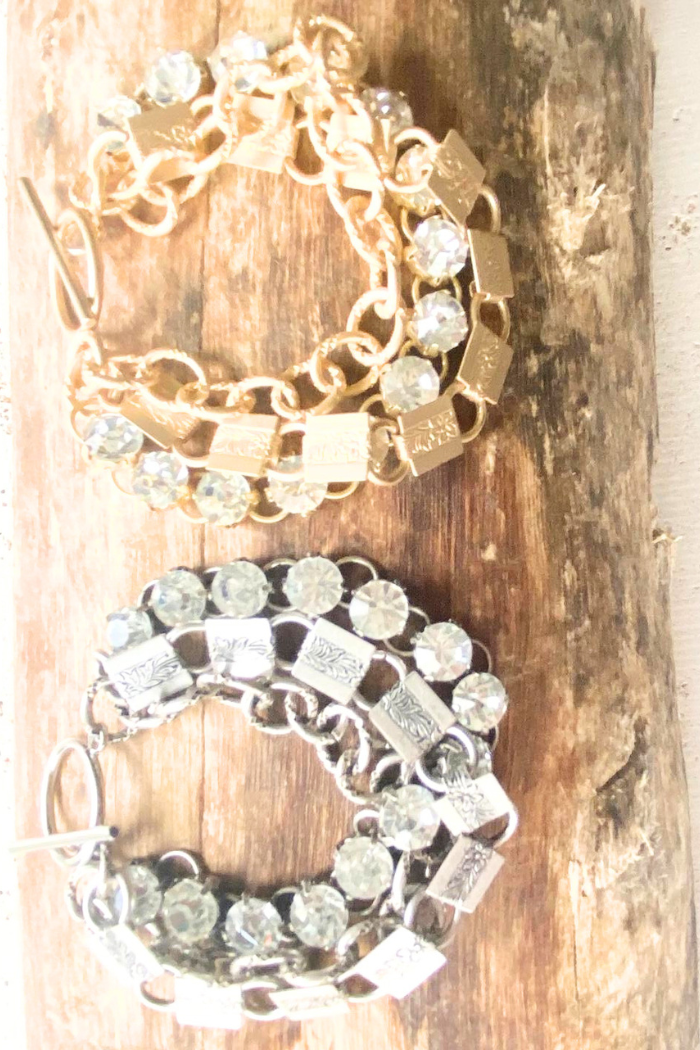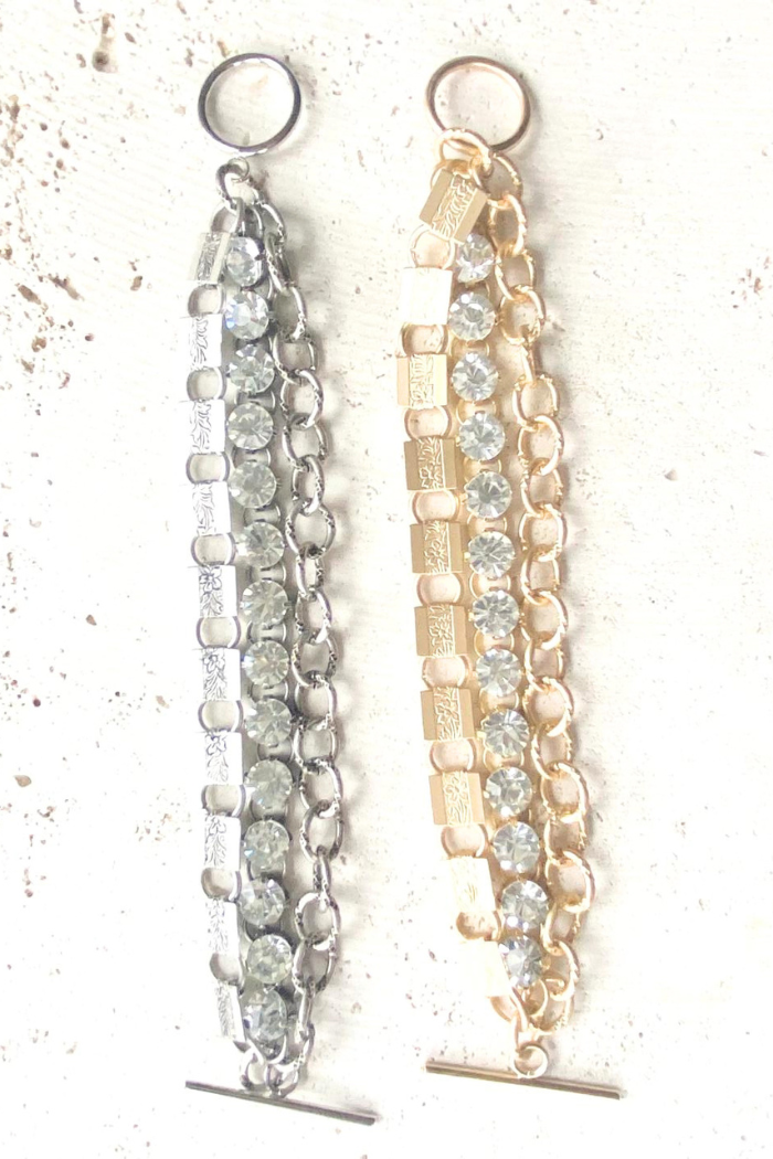 Wow!! This bracelet is a showstopper. It features 3 layers of different vintage replica chains. The Sparkly 8mm crystals really catch the eye. Over sized toggle makes it very easy to put on and take off.