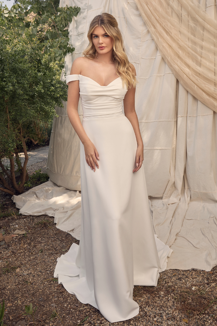 The soft murmur of the water’s edge mingles with the quiet rustle of nearby trees. Baby birds chirp from a nest in the leaves, and a bride sighs with relief. BL471 Dove is as pure as her name. This gorgeous ivory wedding gown is cut in a flattering sheath silhouette with a cowl neckline and off-shoulder sleeves. At first glance, ‘Dove’ exudes simplicity, but as the gaze grows longer, thoughtful details are revealed. Her elegantly draped 15-point boned bodice connects in a cascading row of covered buttons in the back. Each button whispers tones of lasting love as they seem never-ending on ‘Dove’s’ 58-inch train. As sophisticated as she is practical, this gown is crafted from soft satin and stretch chiffon, the most desired fabric for comfortability throughout a bride’s big day. Complete this look with her classic 3-tiered fingertip veil, BL471V, offered separately.