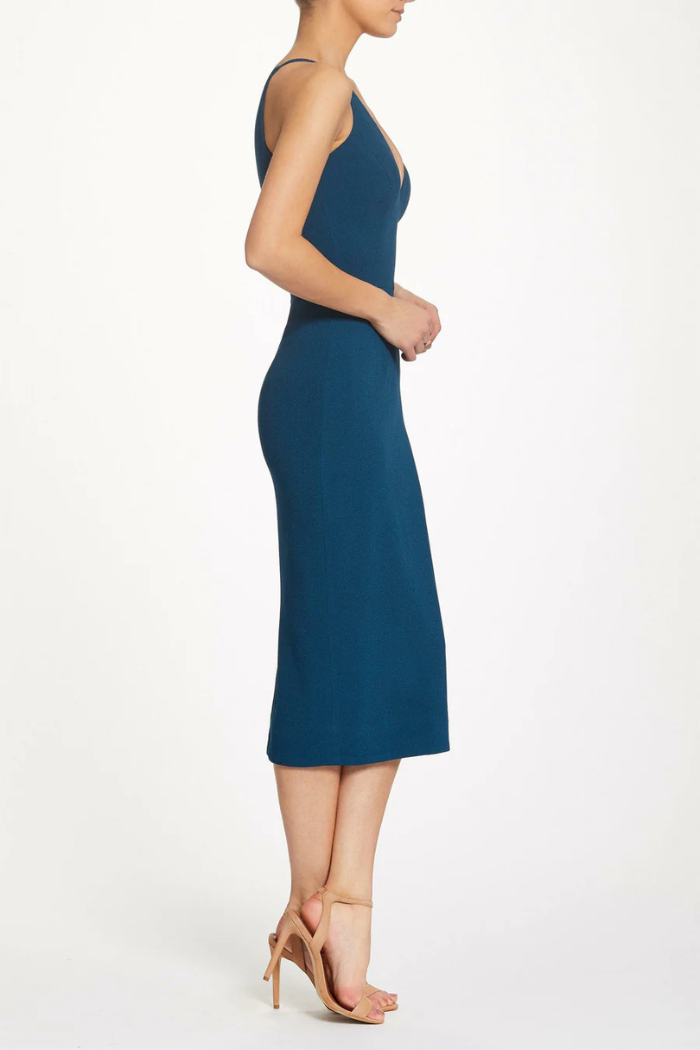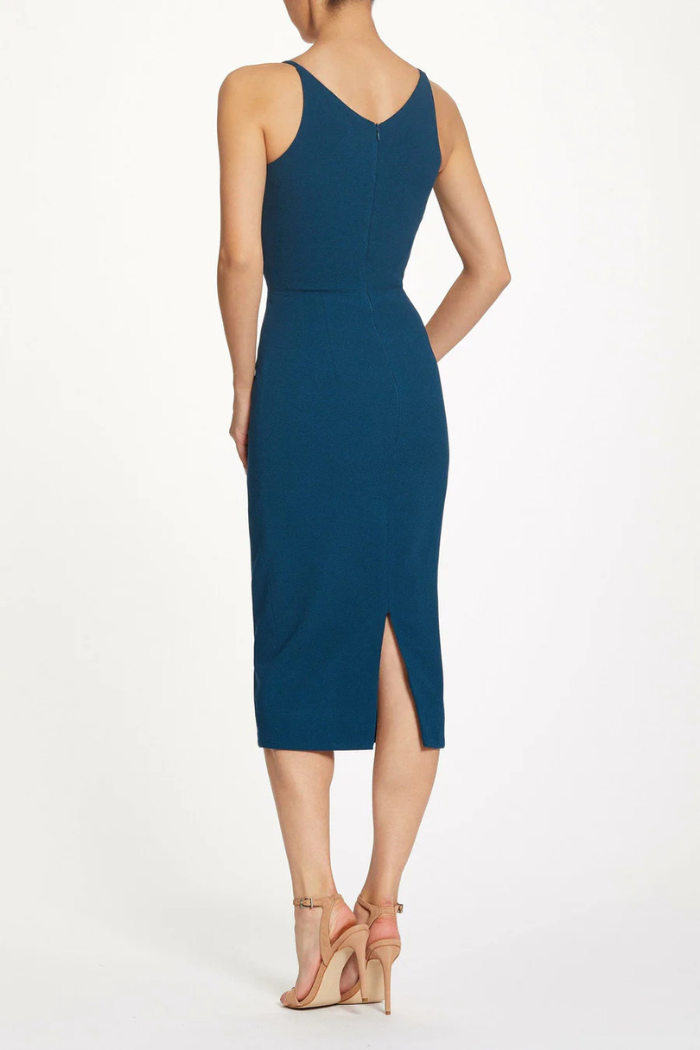 This sleek dress is a slim sheath silhouette with a fitted bodice, making it as versatile as it is timeless. It features a deep v-neckline and a low curved back. The straight, form-fitting skirt reaches just below the knee and has a slit in the back for style and mobility. This dress is made of a flattering crepe fabric.