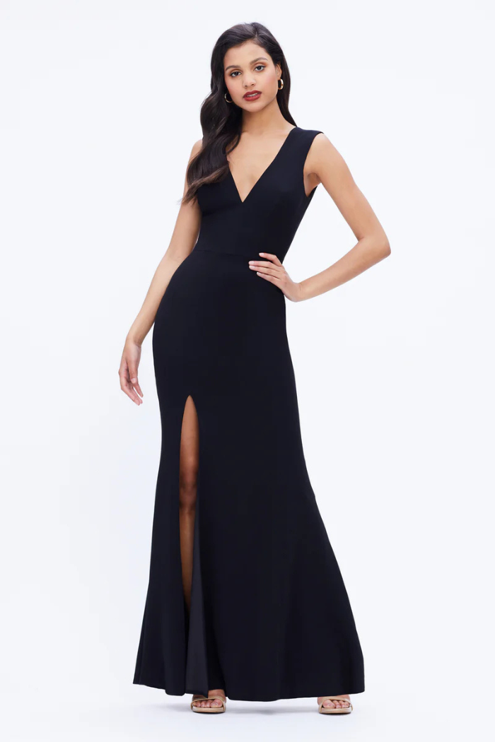 This striking floor-length style is made in our classic stretch crepe. This sleeveless mermaid gown fits snuggly through the torso and hips and has a subtly flared skirt. It features a plunging v-neckline, curved v-back, and a thigh-high side slit.