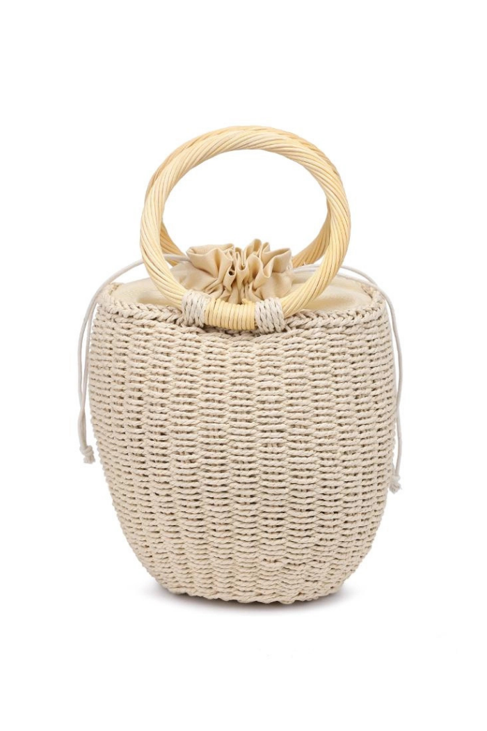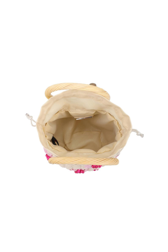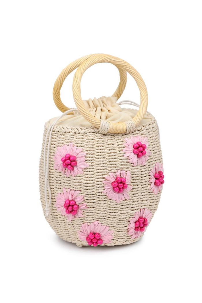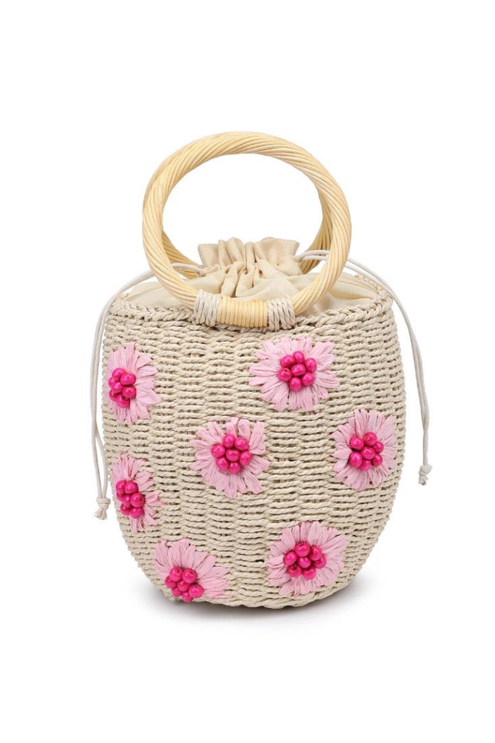 - Exterior Details: Woven Design, Floral Pattern With Bead Details, Dual Ring Handle
